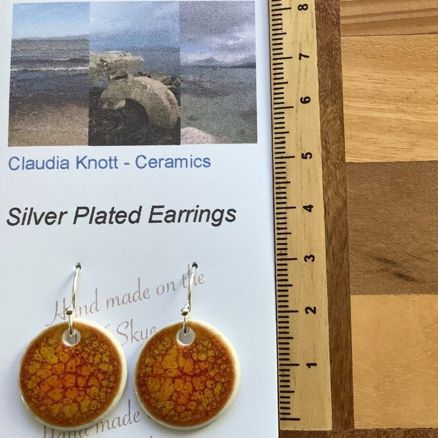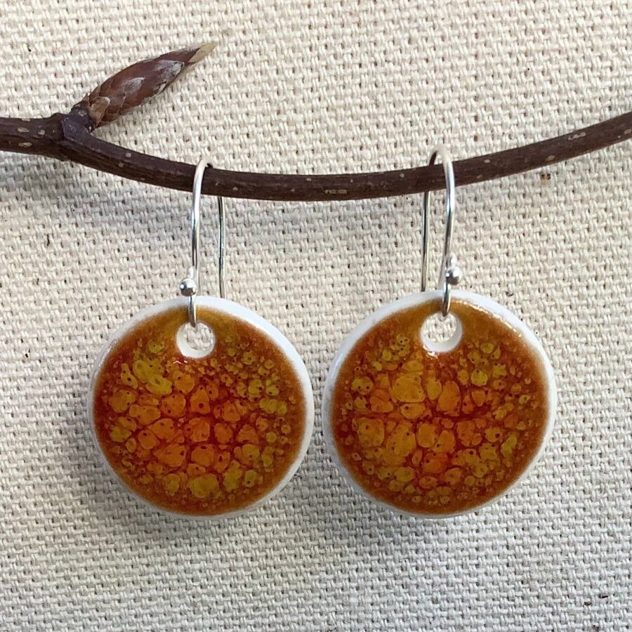 A pair of medium round ceramic earrings with silver plated ear hooks. The earrings are made of white stoneware clay with an Orange Ember glaze. These earrings are individually handcrafted with slight variations of glaze, pattern and design.