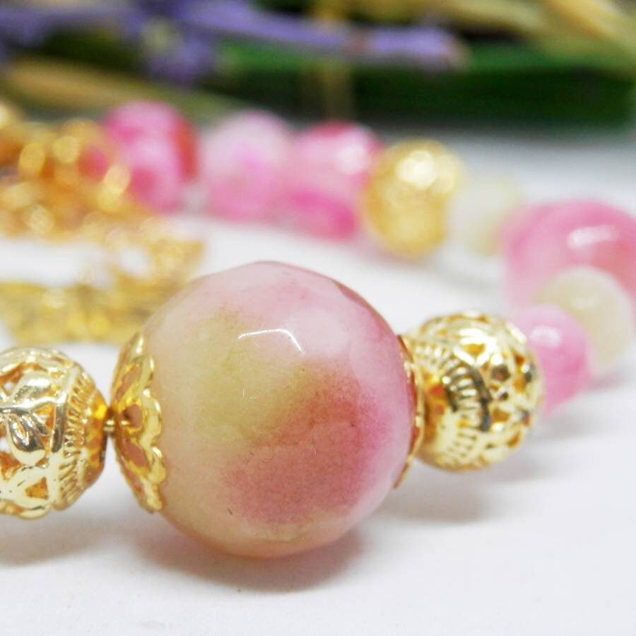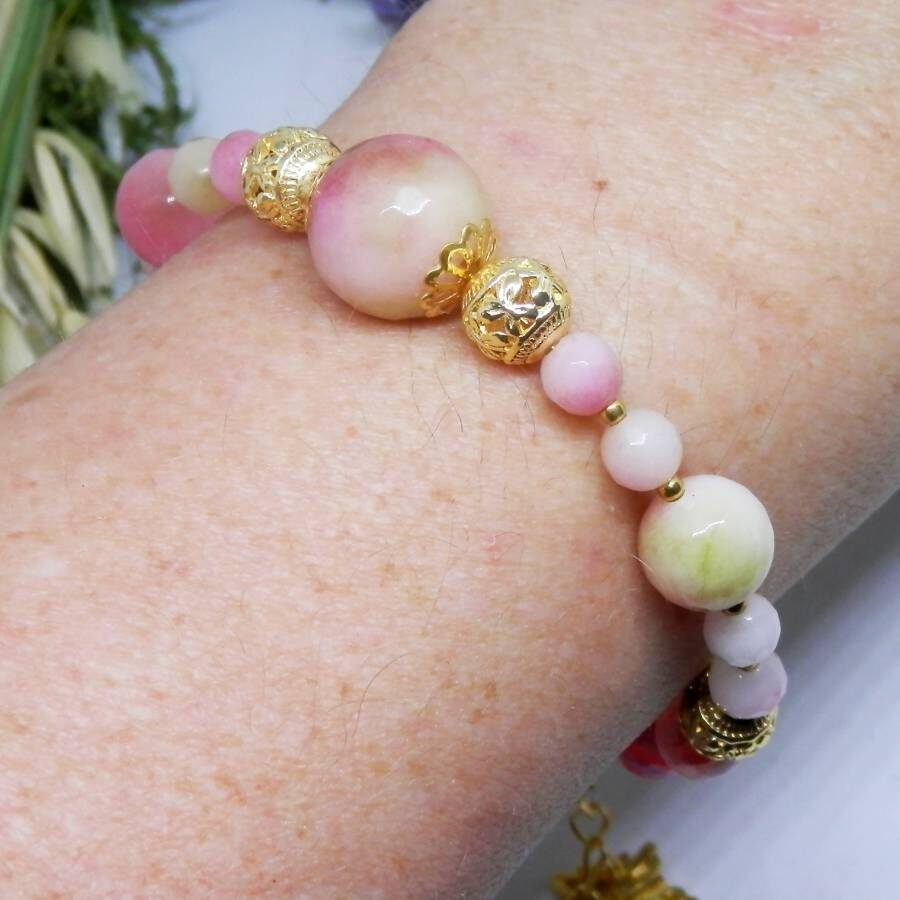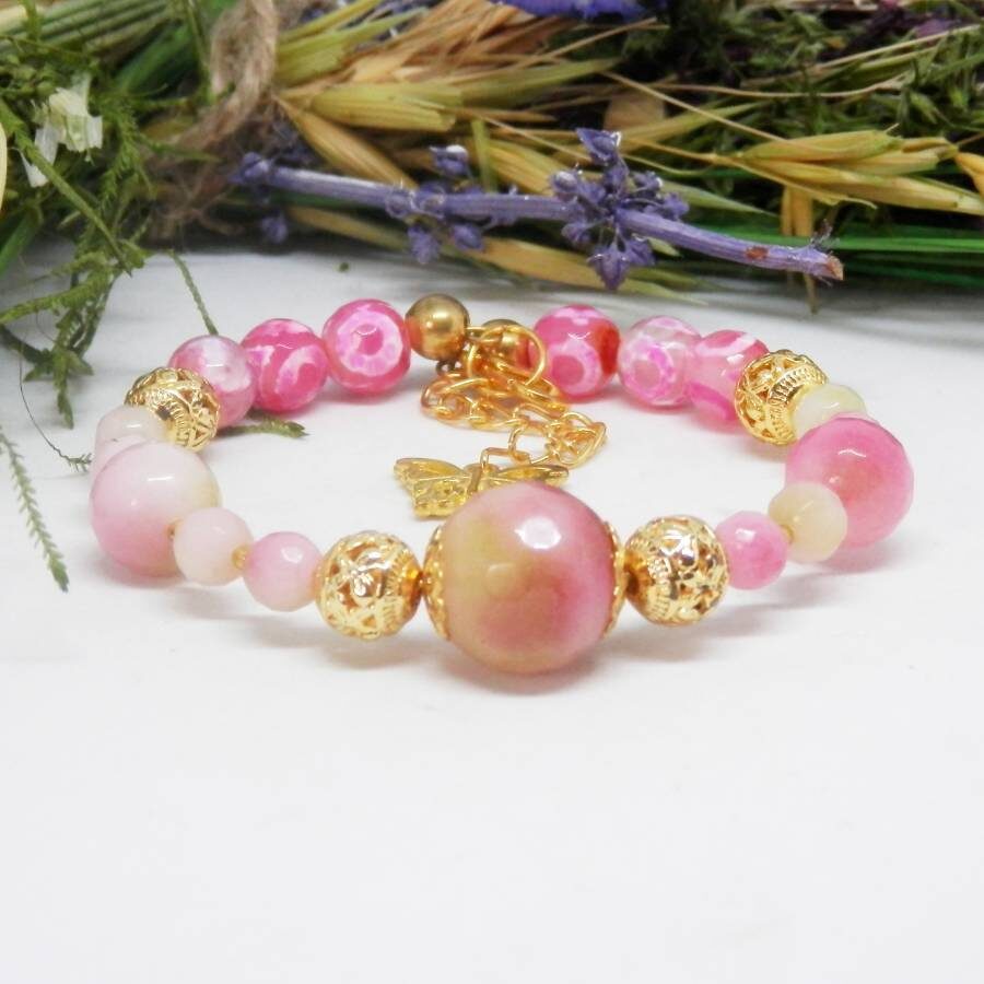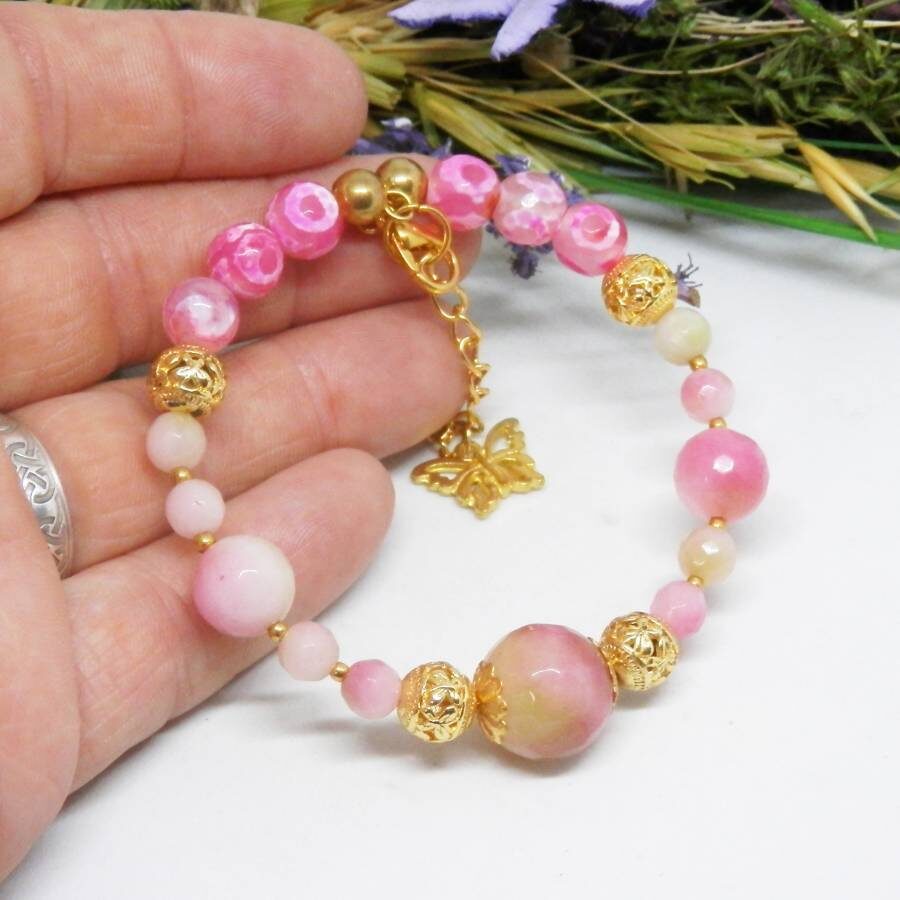 This fabulous pink agate memory wire bracelet is made using gold plated memory wire, gold toned spacer beads and a variety of beautiful faceted and round pink agate beads. Comes with a gold plated butterfly shaped charm. Nickle and lead free. It would fit up to a 7 inch wrist, but comes with an extension chain for larger sizes. Comes to you wrapped in tissue, no plastic. Posted in repurposed envelopes or boxes as the maker is trying to do her tiny bit for the environment by reusing my postage wrappings.