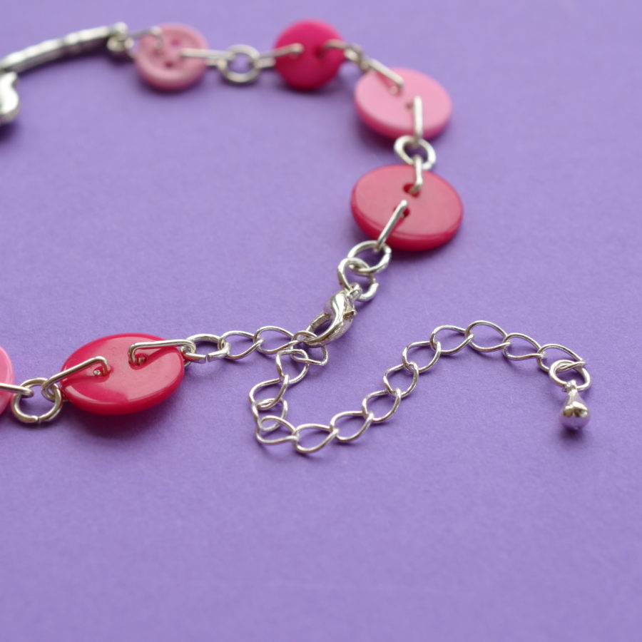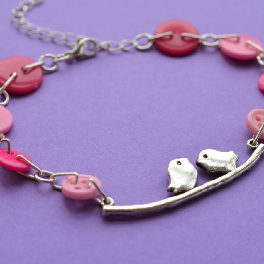 Two little birdies are perched on a wire with a string of small buttons linked together with silver-plated findings. Fastens with a lobster clasp and an extender chain to fit most wrists. The bracelet is 19cm long, plus 5cm extender chain and comes supplied in a gift pouch.