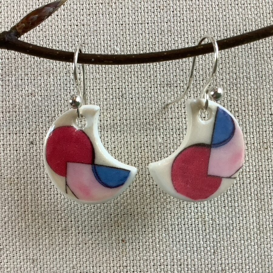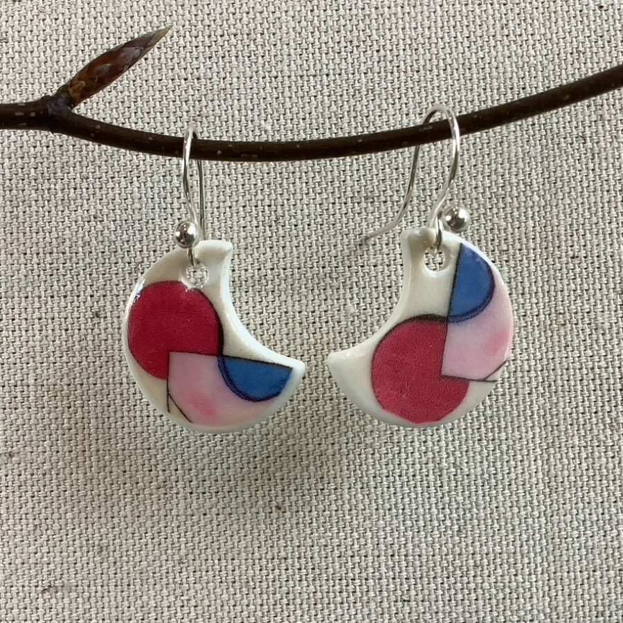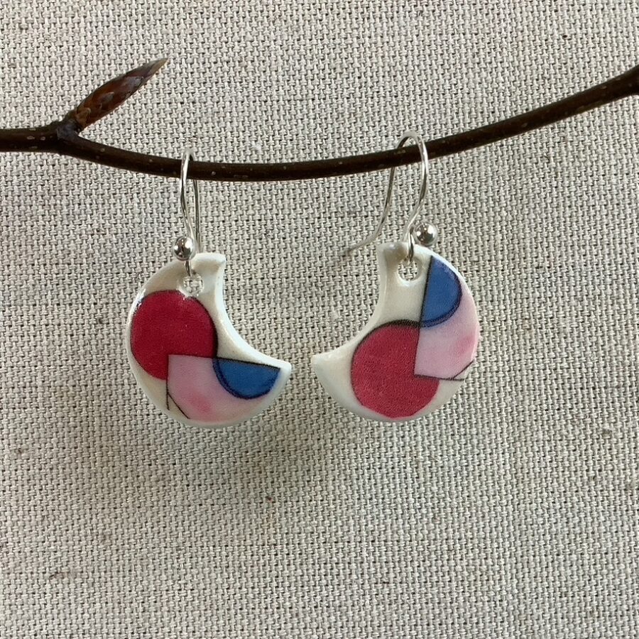 A pair of crescent shaped ceramic earrings with sterling silver ear hooks. The earrings are made of white-stoneware clay with a hand-drawn ceramic transfer of pink and blue geometric design. These earrings are individually handcrafted with slight variations of glaze, pattern and design.