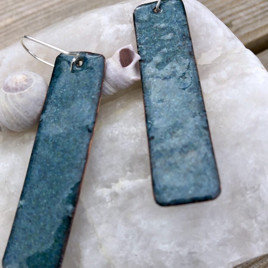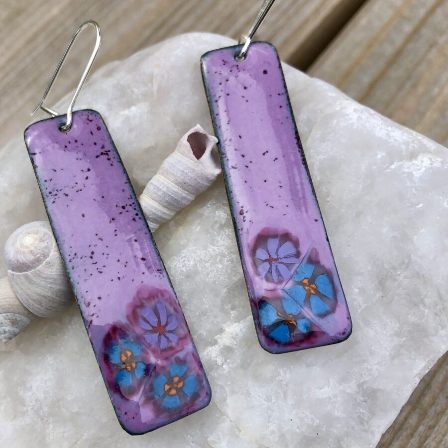A pretty pair of pink enamelled copper earrings with flowers on sterling silver ear wires. Counter enamelled on the back.
