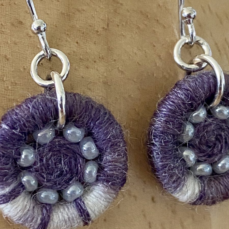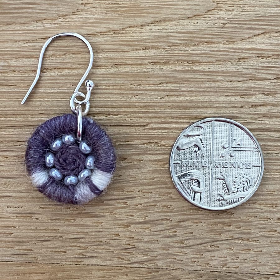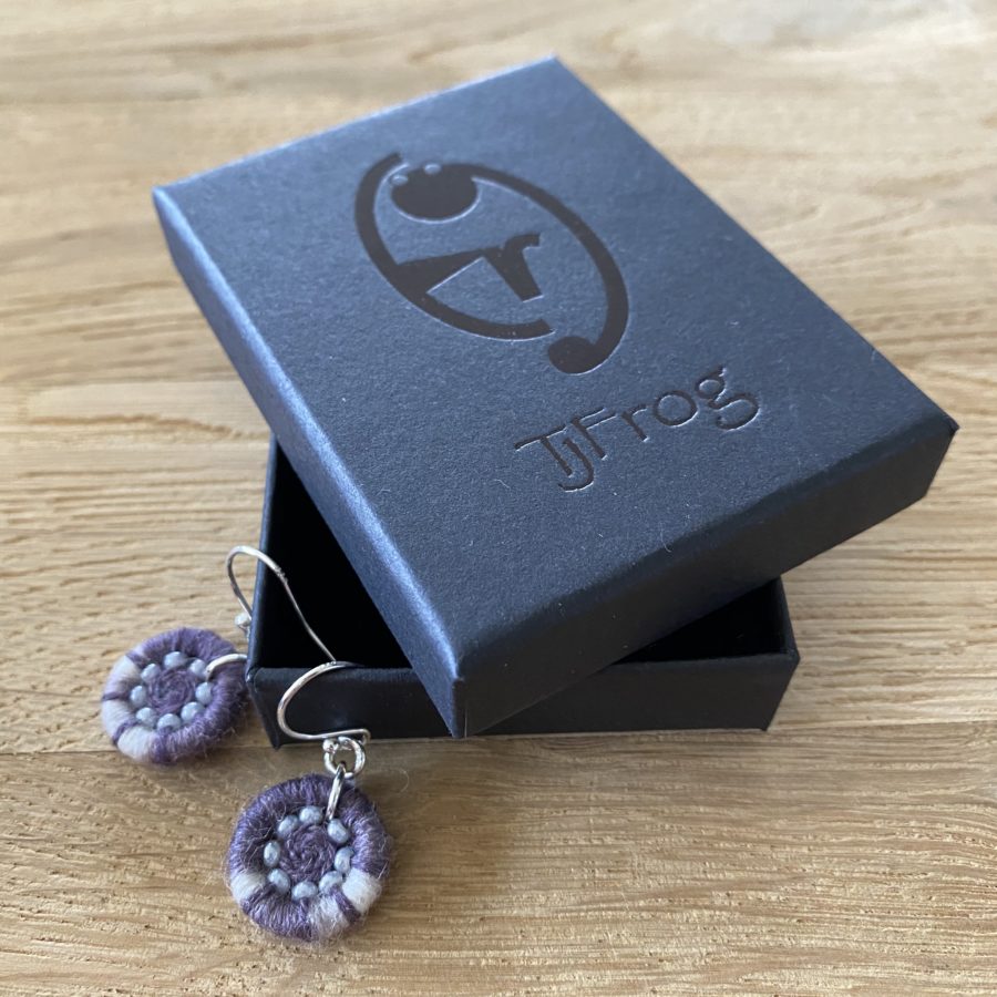 Beautiful earrings made using techniques of the heritage craft of Dorset Buttons. Yarn hand dyed in the Scottish Highlands combined with white pearl effect beads and finished off with sterling silver findings. All wrapped up in a TJFrog gift box made from recycled card and paper.