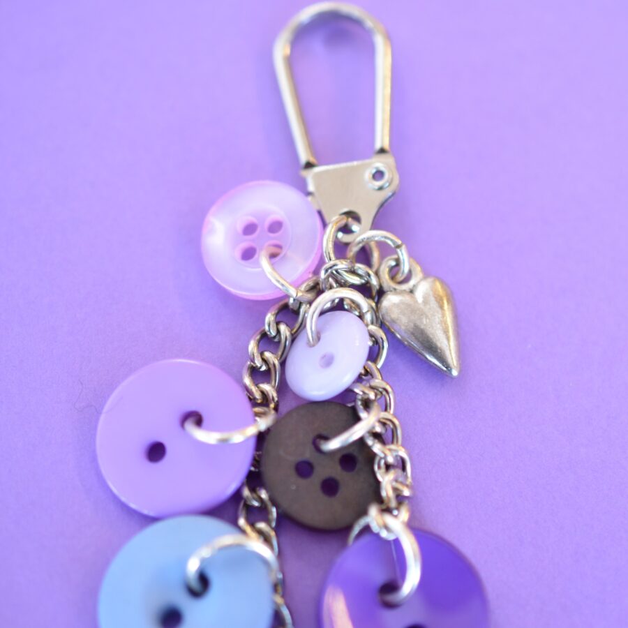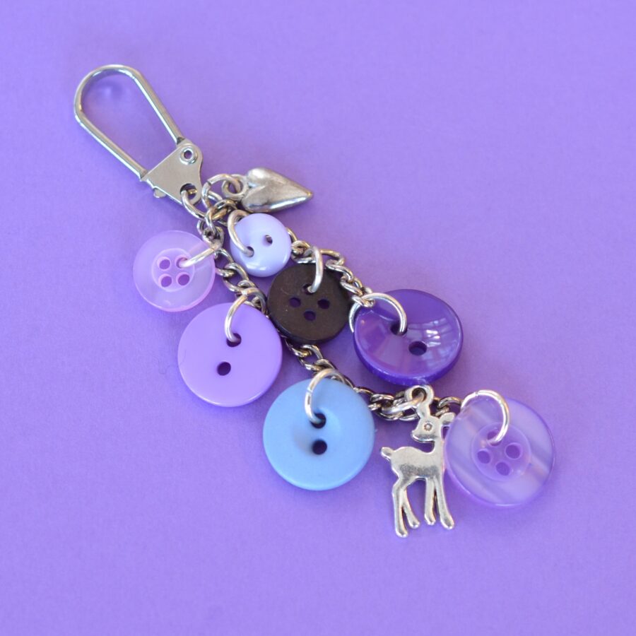 Wee cluster bag charm keyring with purple buttons and deer and heart charms. Approx. 9.5cm long. Supplied in gift pouch.