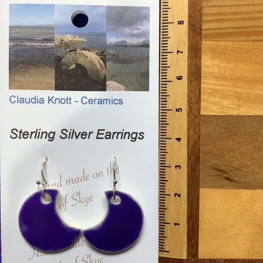 A pair of crescent shaped ceramic earrings with sterling silver ear hooks. The earrings are made of white stoneware clay with a purple matt glaze. These earrings are individually handcrafted with slight variations of glaze, pattern and design.