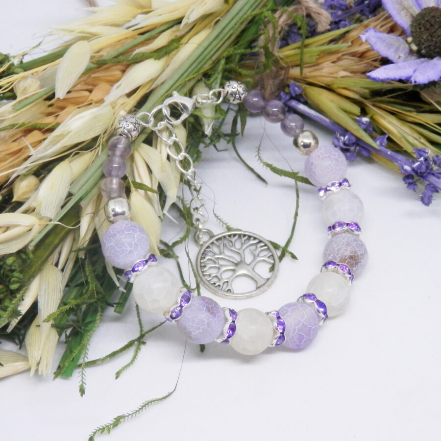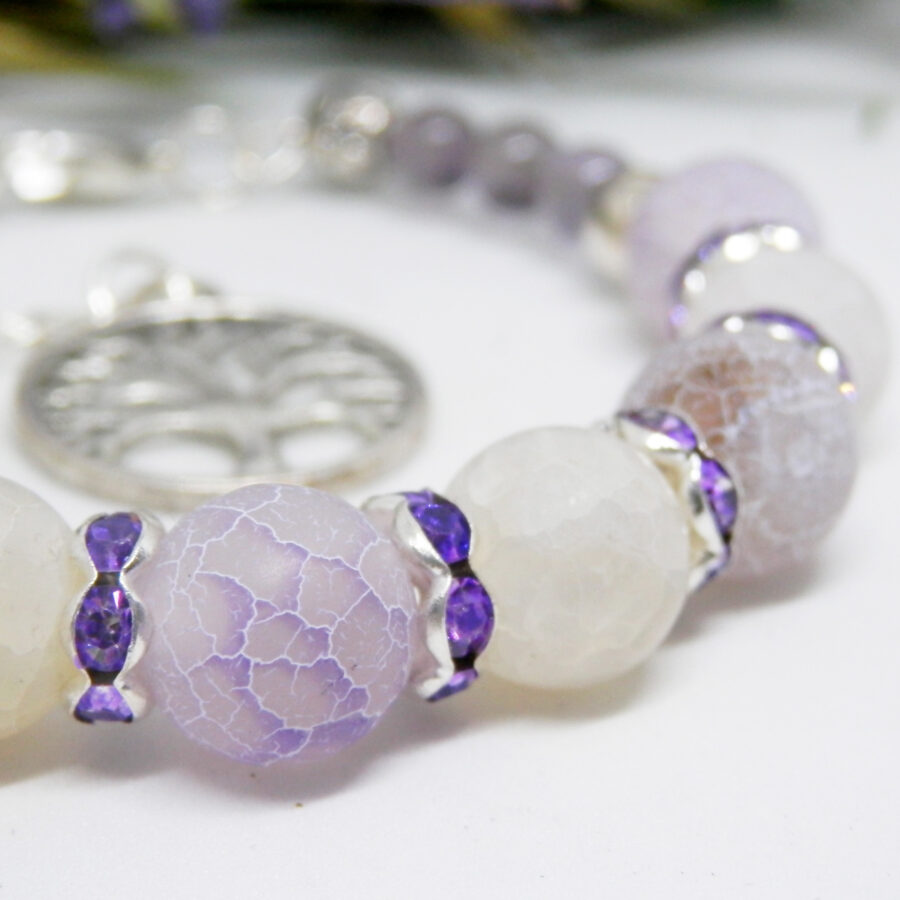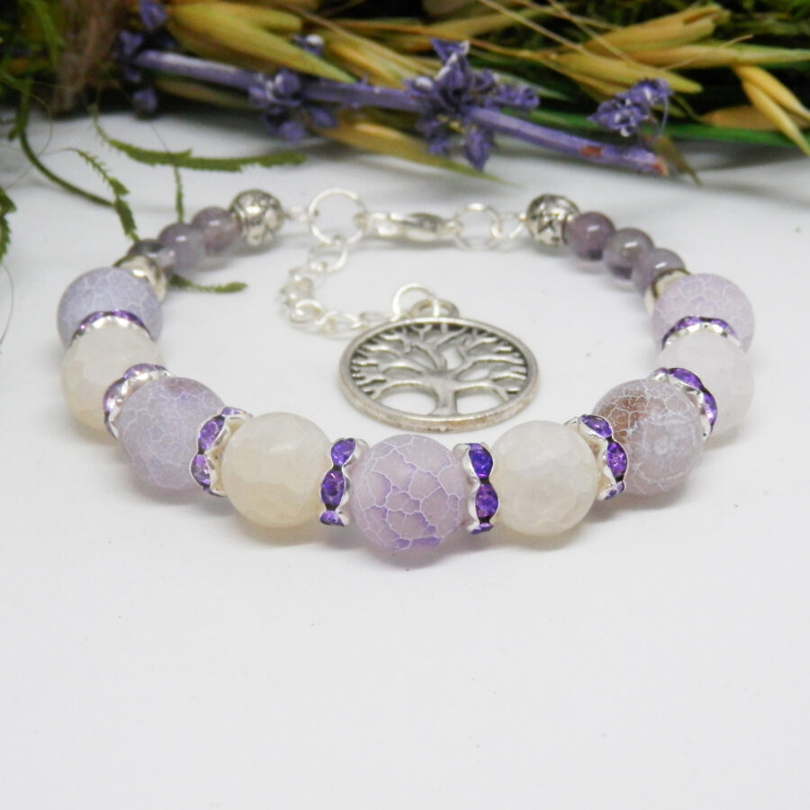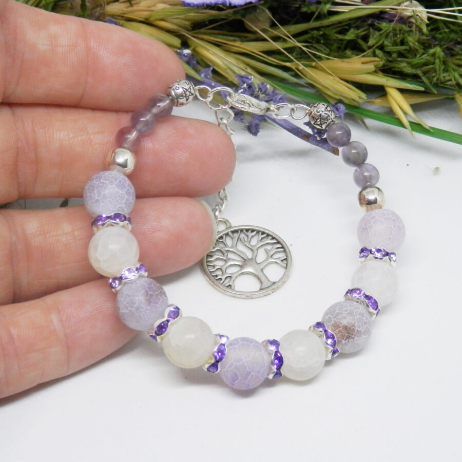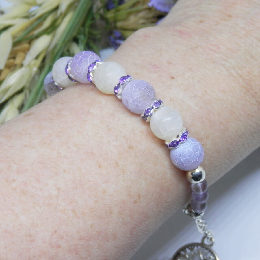 A stunning memory wire bracelet made using silver plated wire, diamante spacers and clasp, with beautiful pale purple and ice white dragon's vein agate beads and little pale amethyst beads. Nickel and lead free. It fits up to a 6.5 inch wrist, but has an extension chain for larger sized wrists. Posted in repurposed envelopes or boxes – trying to do my tiny bit for the environment by reusing my postage wrappings.