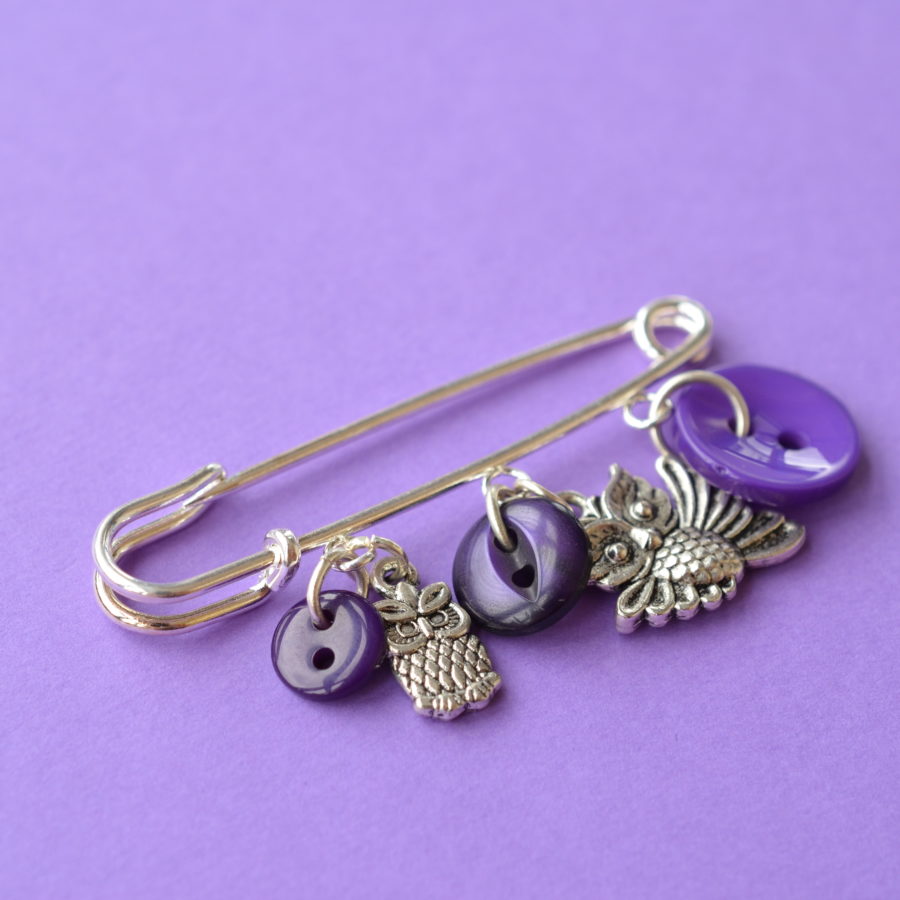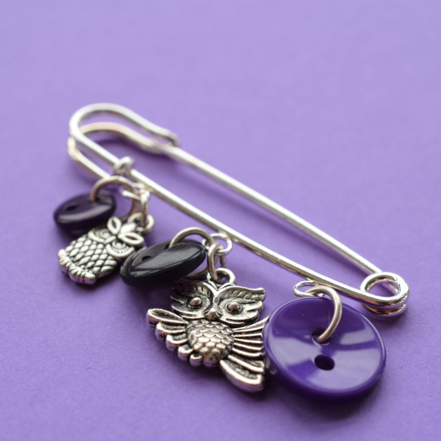 Two-inch silver-plated pin with purple buttons and owl themed charms. This is lovely worn as a brooch, shawl pin, decorating a bag or hat or even just on your kilt. All the findings are silver plated. The brooch is supplied in gift pouch.