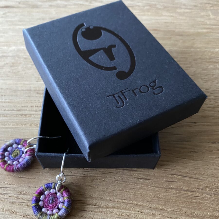 Beautiful earrings made using techniques of the heritage craft of Dorset Buttons. Yarn hand dyed in the Scottish Highlands combined with clear beads and finished off with sterling silver findings. All wrapped up in a TJFrog gift box made from recycled card and paper.