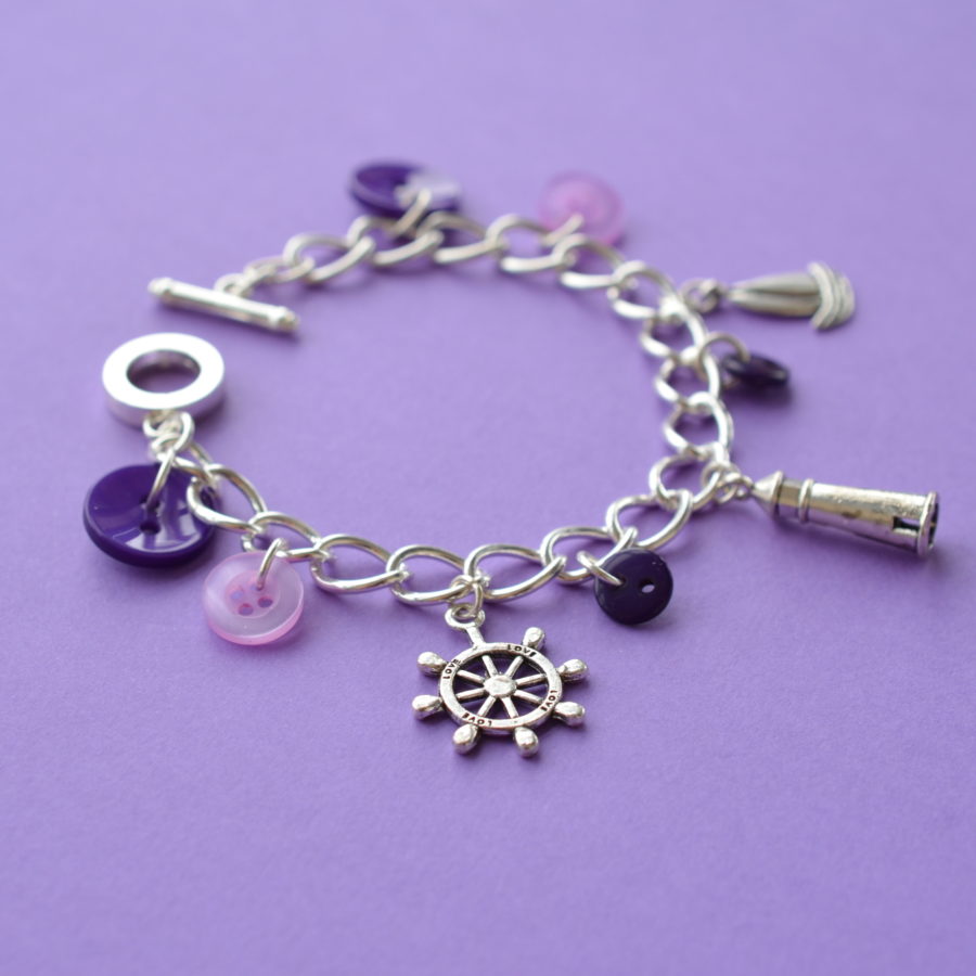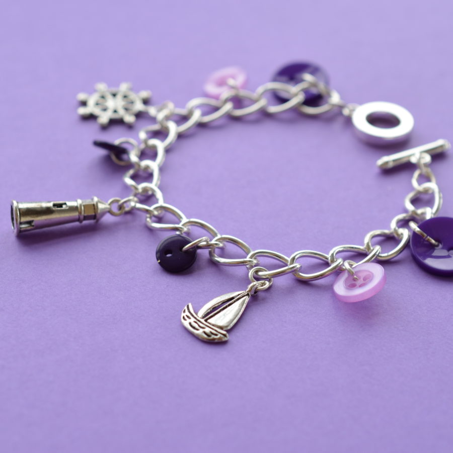 This heavy bracelet chain has a toggle clasp and is adorned with buttons & sailing themed charms, including a sailing boat/yacht, rudder and lighthouse. The chain is 19 cm long and made with silver-plated findings. Supplied in gift pouch.