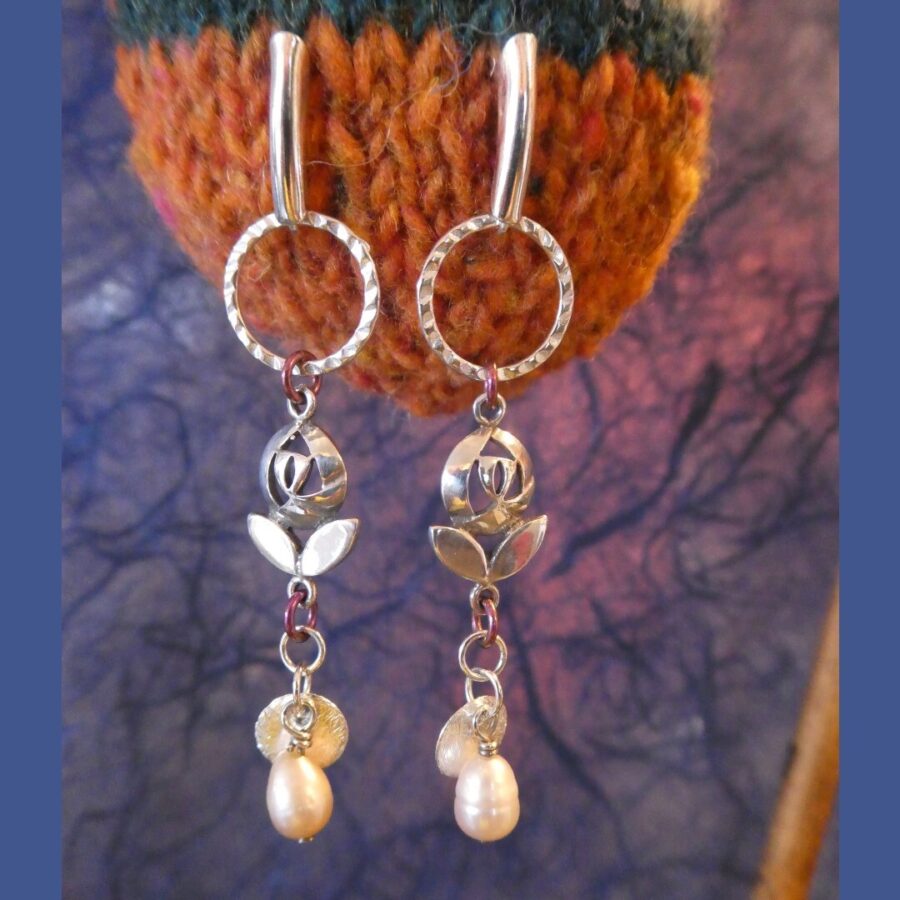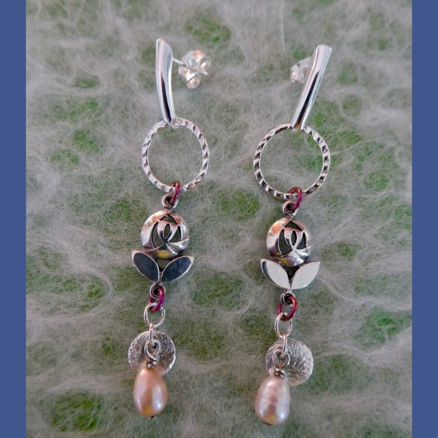 A pair of sterling silver R McIntosh inspired earrings, hammered links, anodised niobium links, freshwater pearl drop. Gift box included (sent flat packed and jewellery wrapped in tissue to just pop in).