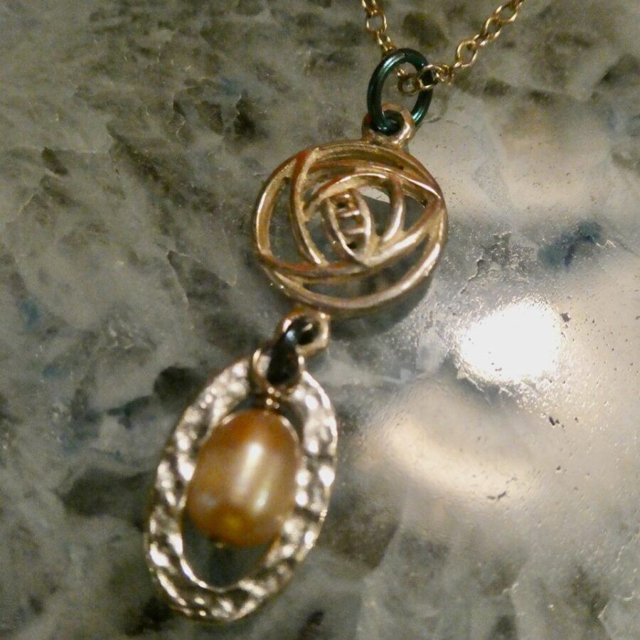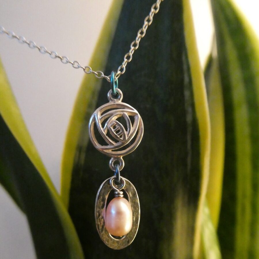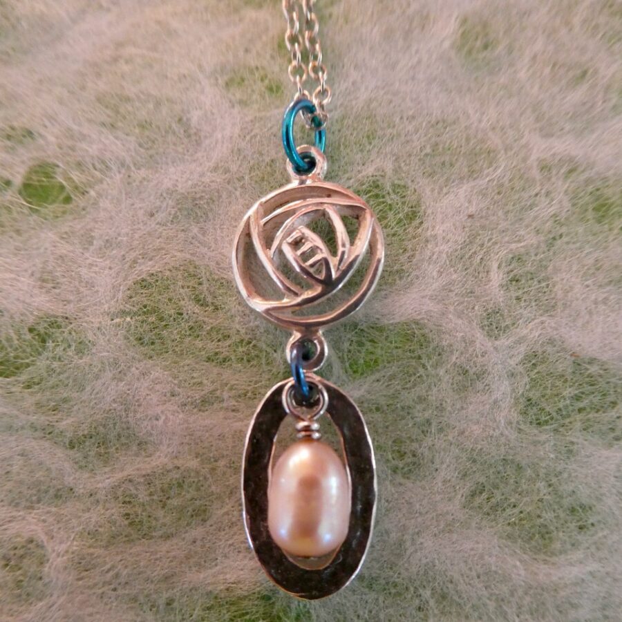 A sterling silver R McIntosh inspired pendant with hammered oval silver drop and freshwater pearl, anodised niobium links on 16” sterling silver trace chain. Gift box included (sent flat packed and jewellery wrapped in tissue to just pop in).