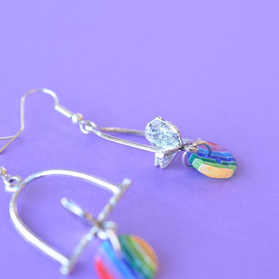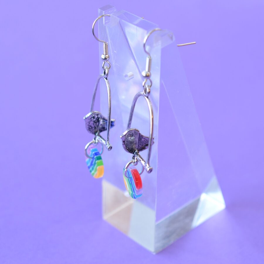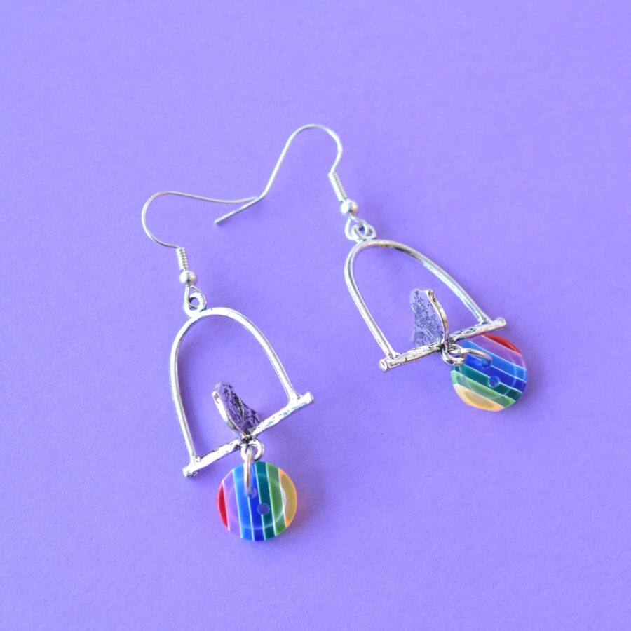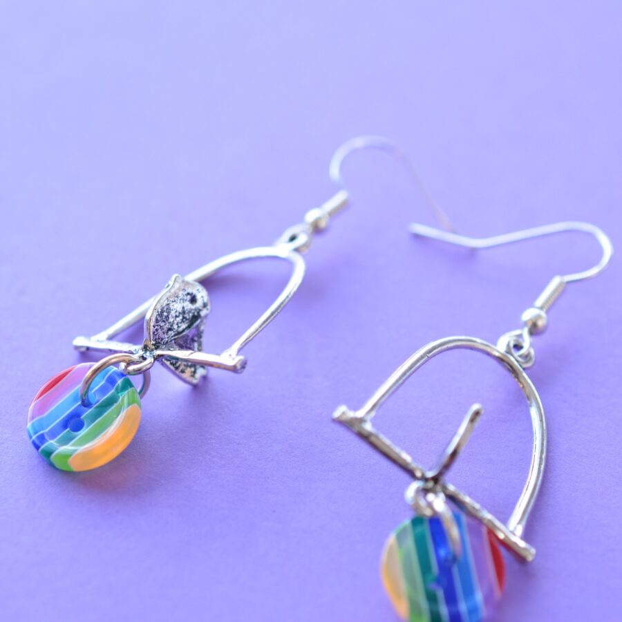 Cute silver bird on a perch with a small rainbow striped button dangling at the base. Ear findings are sterling silver, other findings are silver-plated. Full length of earring from top of the hook is approx. 5.5cm. Supplied in a gift pouch.