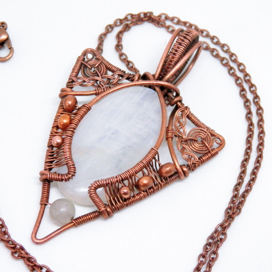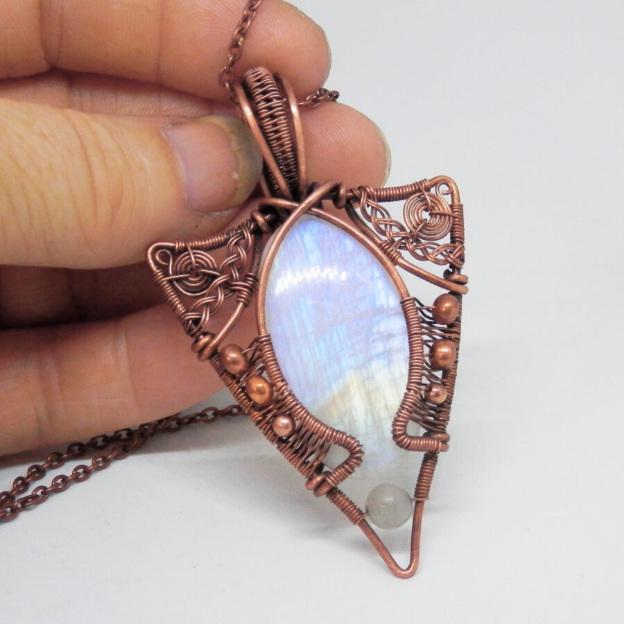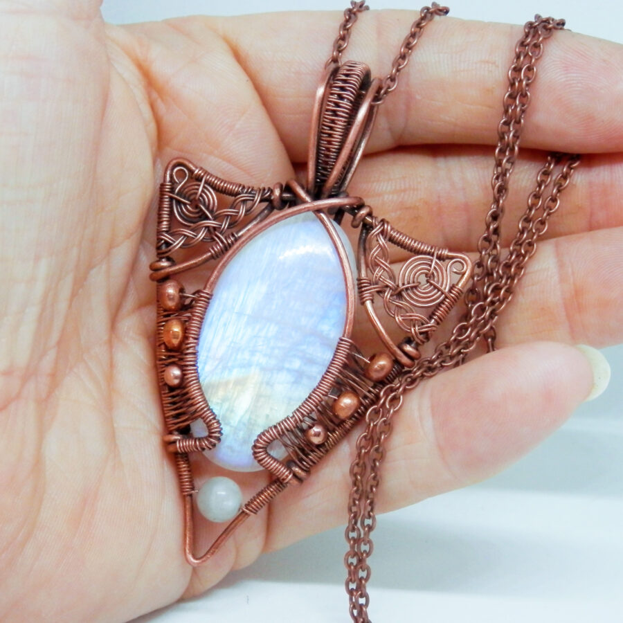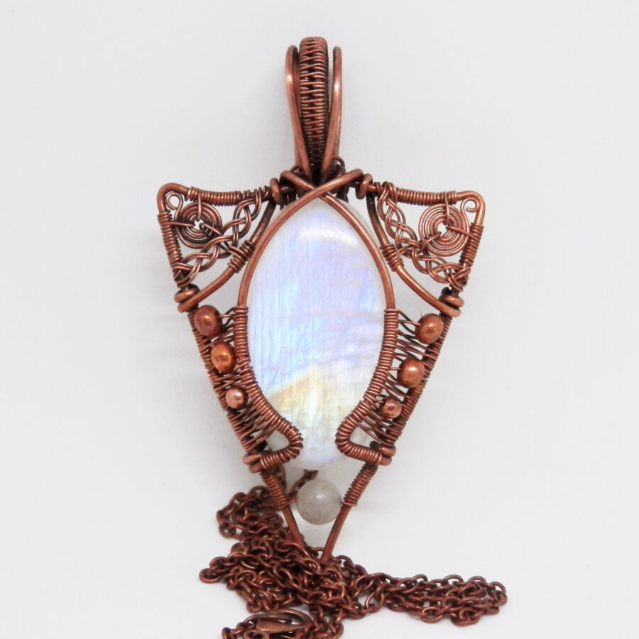 A very striking piece of rainbow moonstone has been wrapped in antiqued copper wire in a Celtic/Elvish style, with copper beads and rainbow moonstone bead at the bottom.