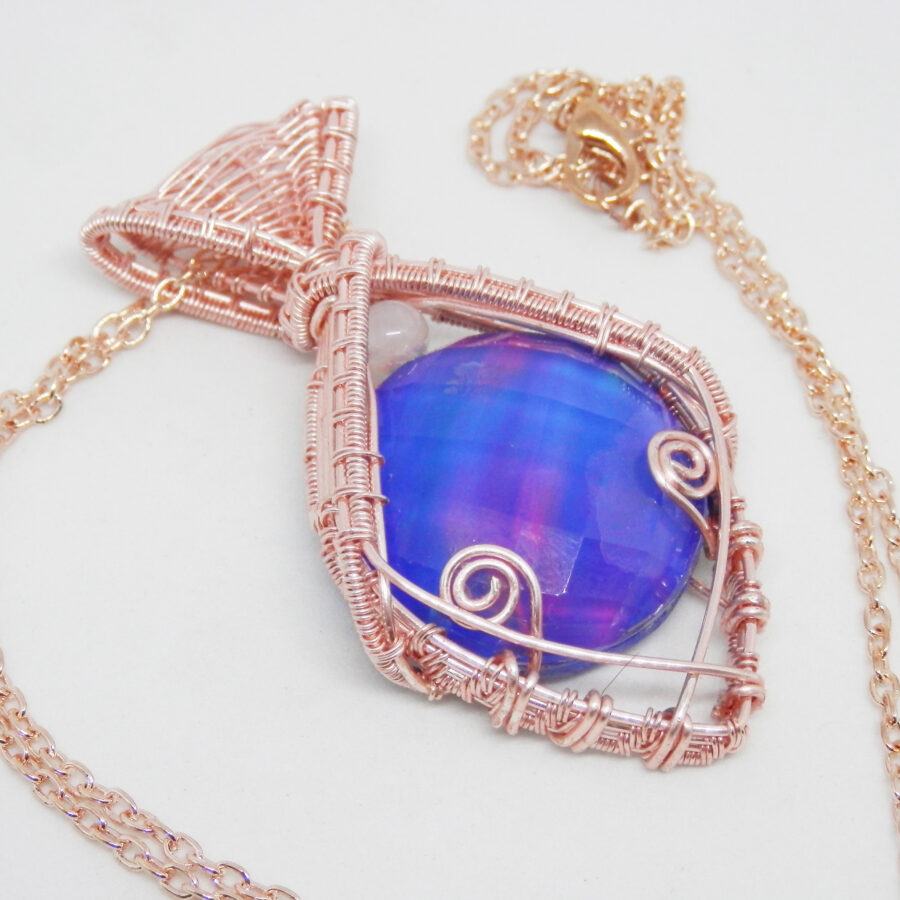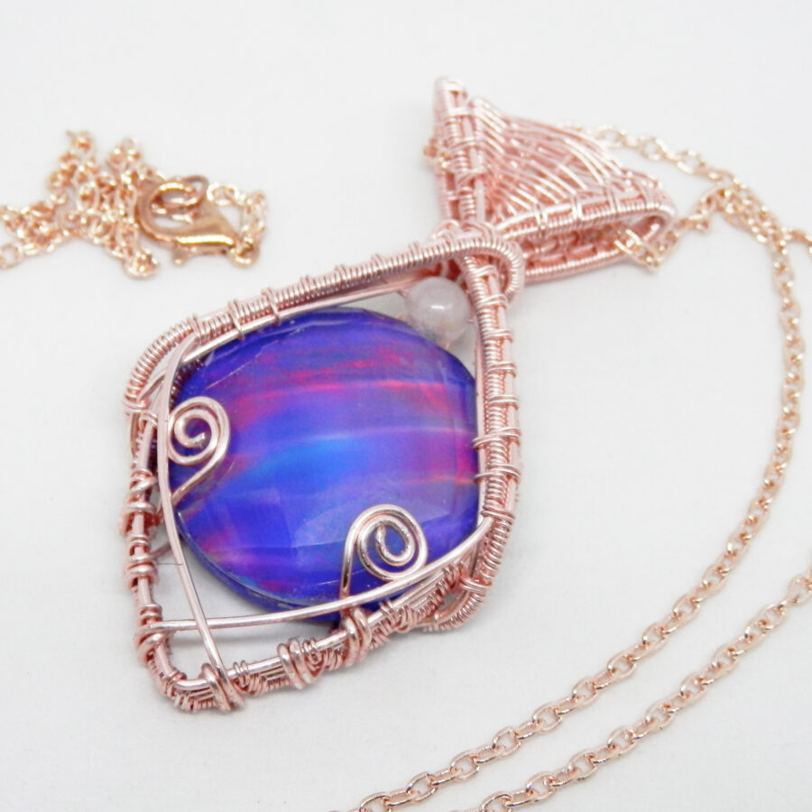 A stunning necklace featuring rose gold plated wire and a most beautiful hand cut and faceted man-made Aurora Opal that shimmers with different colours in the light. The pendant is around 6.5 cm long by around 3.5 cm wide and about 1.4 cm thick at the deepest point. Comes with a 24 inch rose gold plated chain with lobster clasp. Lead and nickel free. This wire wrapped pendant will come to you placed in a soft velvet pouch.