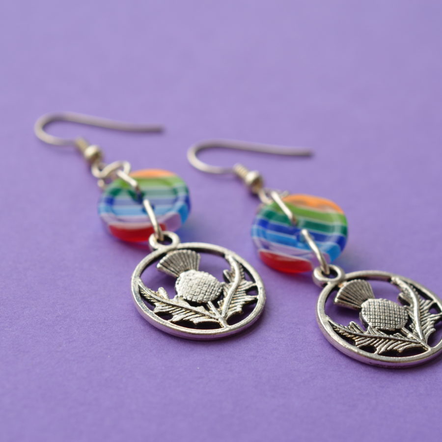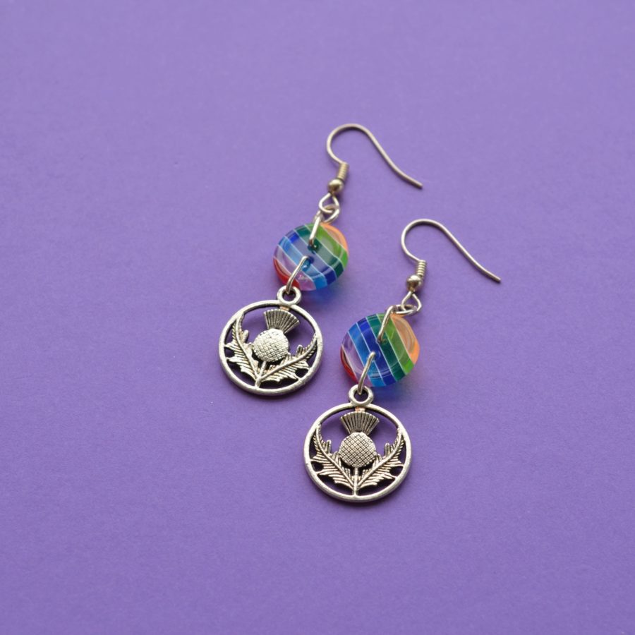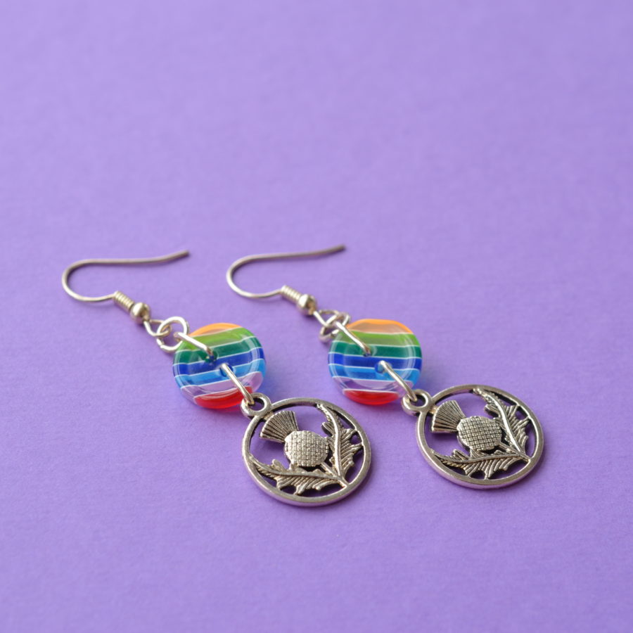 Cute rainbow striped button with a thistle charm hanging at the bottom.Ear findings are sterling silver, other findings are silver-plated. Full length of earring from top of the hook is approx. 5.5cm. This item is supplied in a gift pouch.