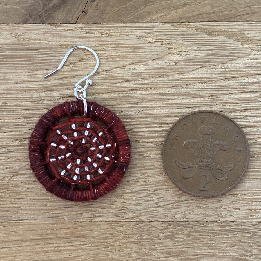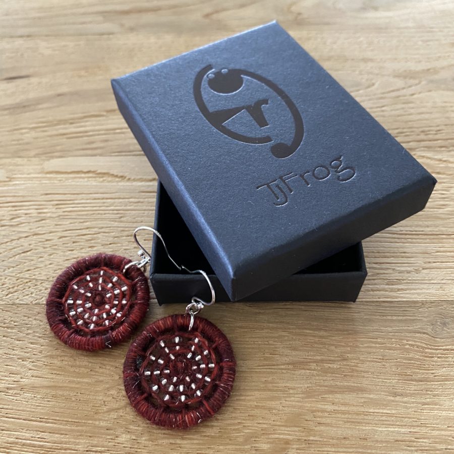 Silver thread runs through this yarn hand-dyed in Scotland combined with clear beads and sterling silver findings to form these beautiful earrings made using techniques of the heritage craft of Dorset Buttons. All wrapped up in a TJFrog gift box made from recycled card and paper.