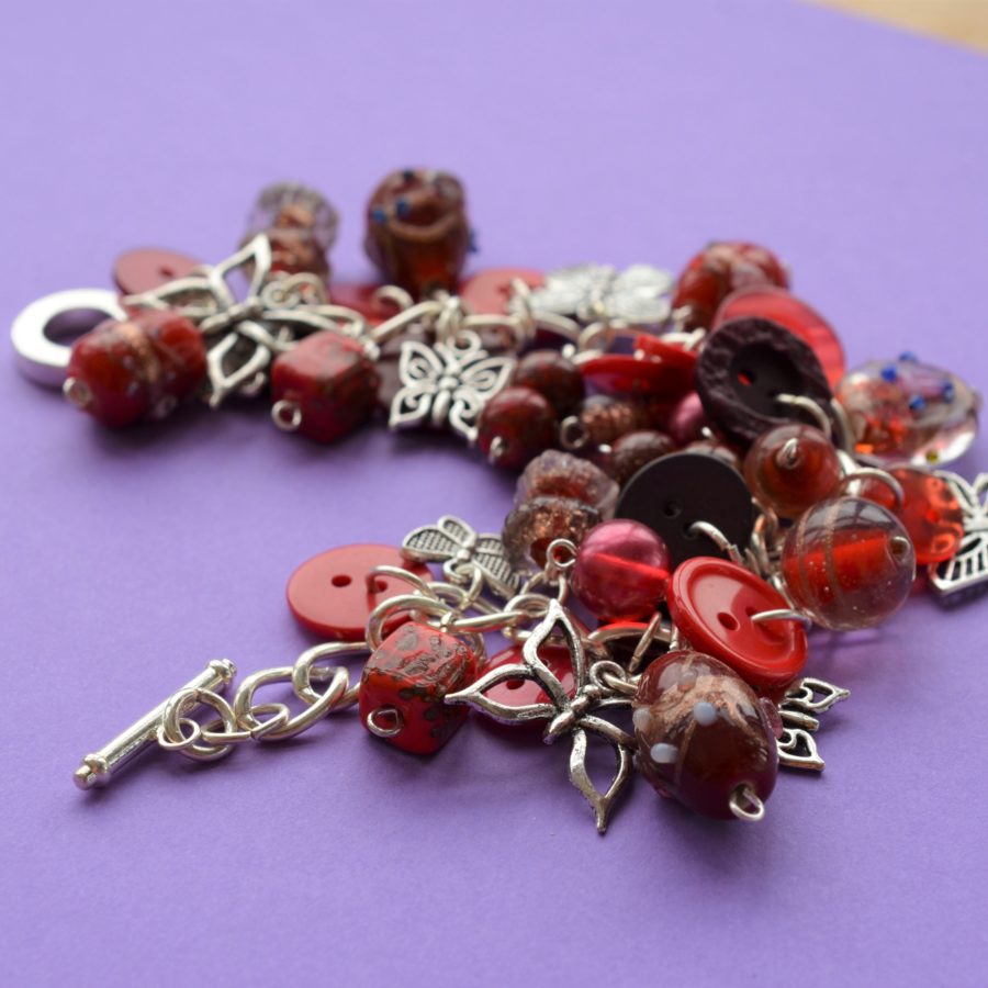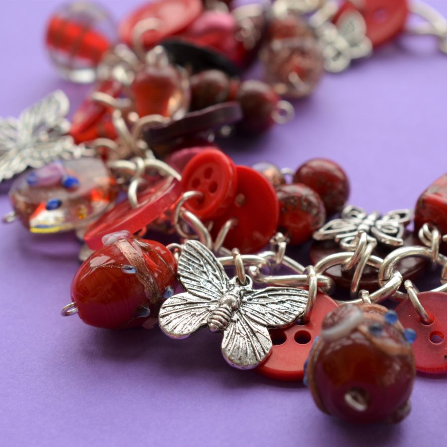 This gorgeous chunky bracelet is loaded with buttons, beads, and butterfly themed charms. It is made with an approx. 19cm heavy silver-plated bracelet chain and fastens with a toggle clasp and with silver-plated findings. Supplied in gift pouch.