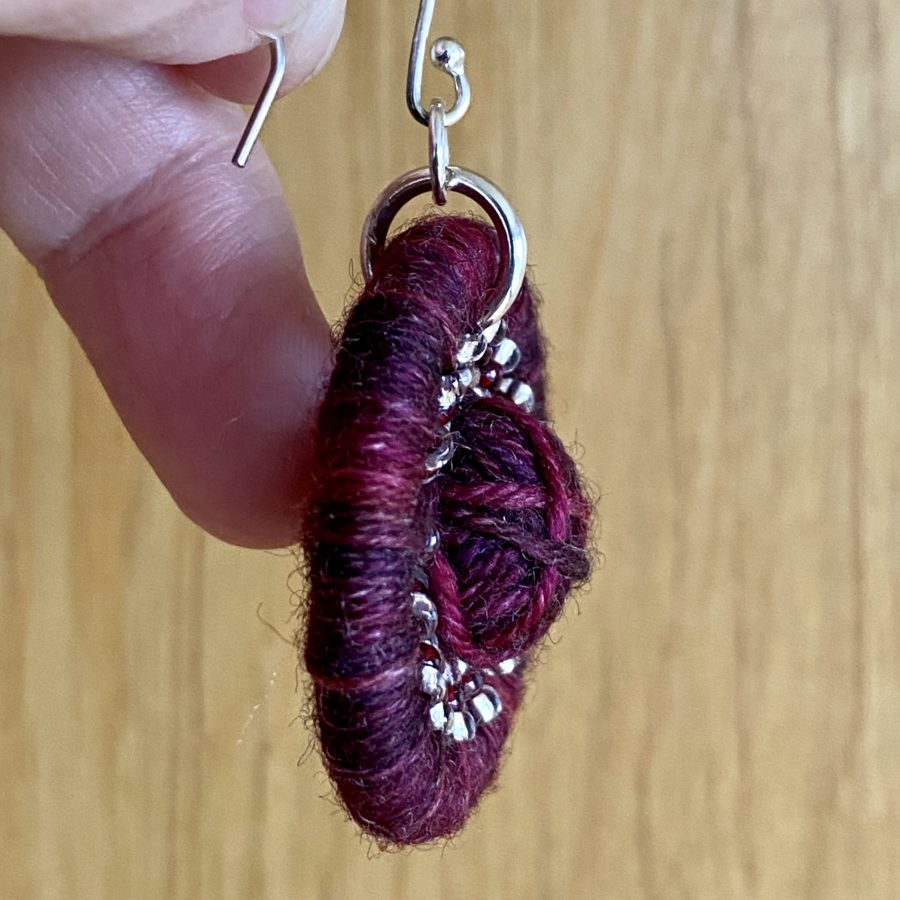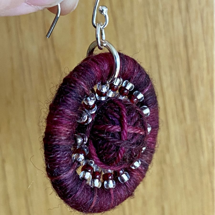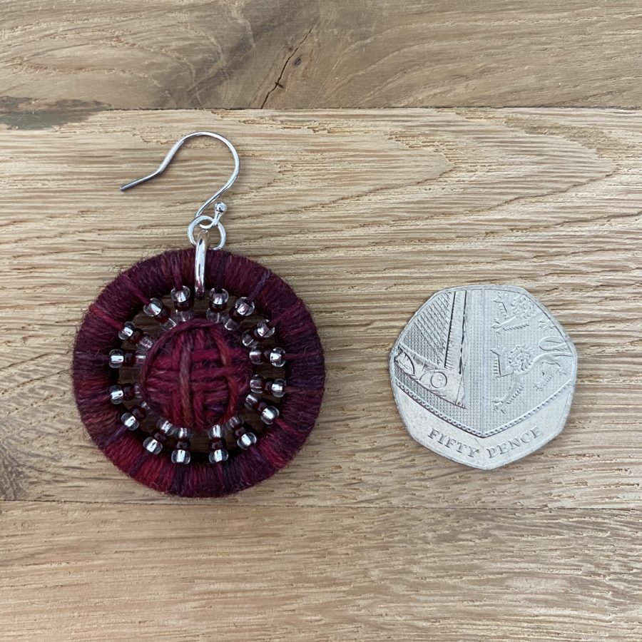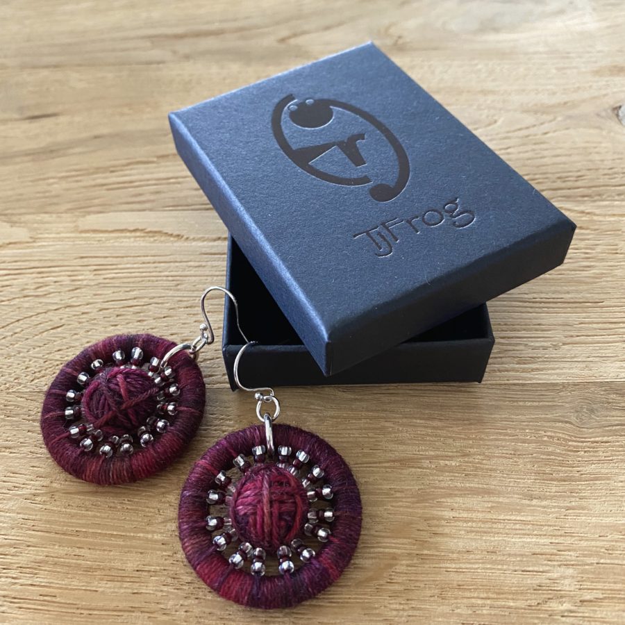 These chunky Dorset Button earrings are embellished with clear and deep red coloured beads. The 3D centre design looks like a tiny ball of yarn. All wrapped up in a TJFrog gift box made from recycled card and paper.