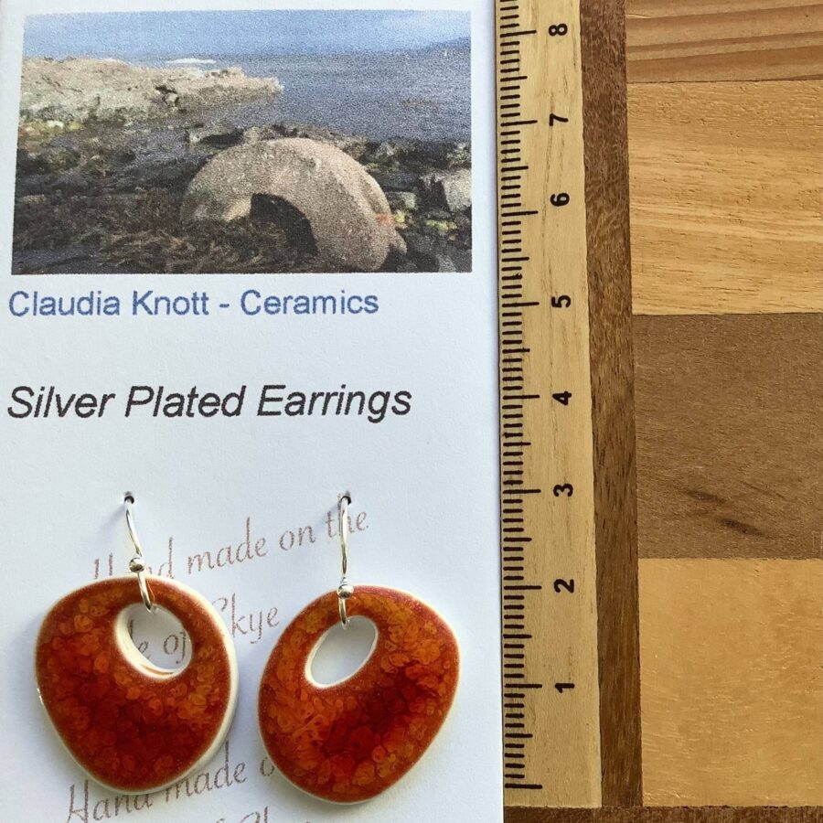 A pair of ‘Mary Quant’ style ceramic earrings with silver plated ear hooks. The earrings are made of white stoneware clay with a Red Ember glaze. These earrings are individually handcrafted with slight variations of glaze, pattern and design.
