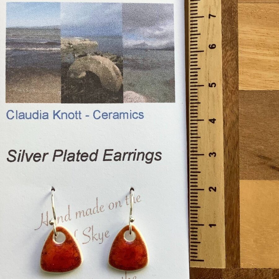 A pair of tiny triangular ceramic earrings with silver plated ear hooks. The earrings are made of white stoneware clay with a Red Ember glaze. These earrings are individually handcrafted with slight variations of glaze, pattern and design.