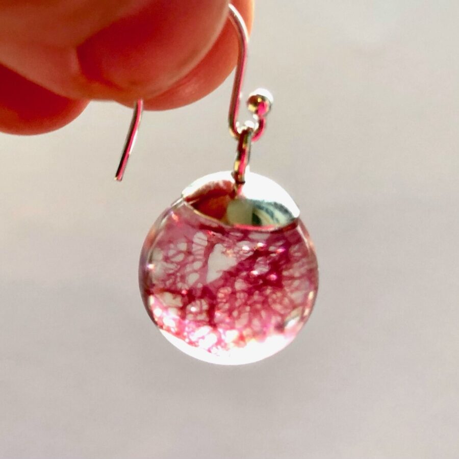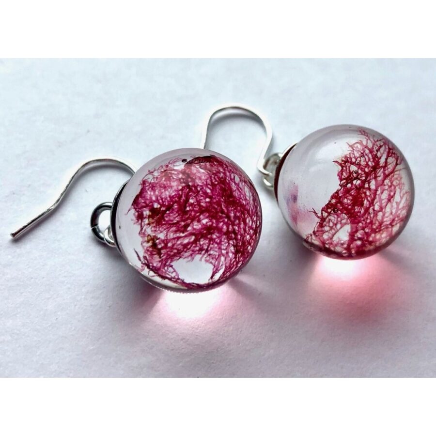 These beautiful and unique earrings feature red fern seaweed encased in a resin ball, hung from sterling silver ear hooks. It comes gift boxed.