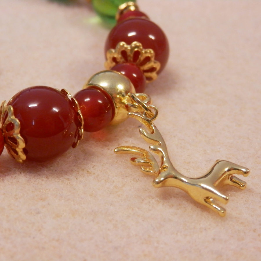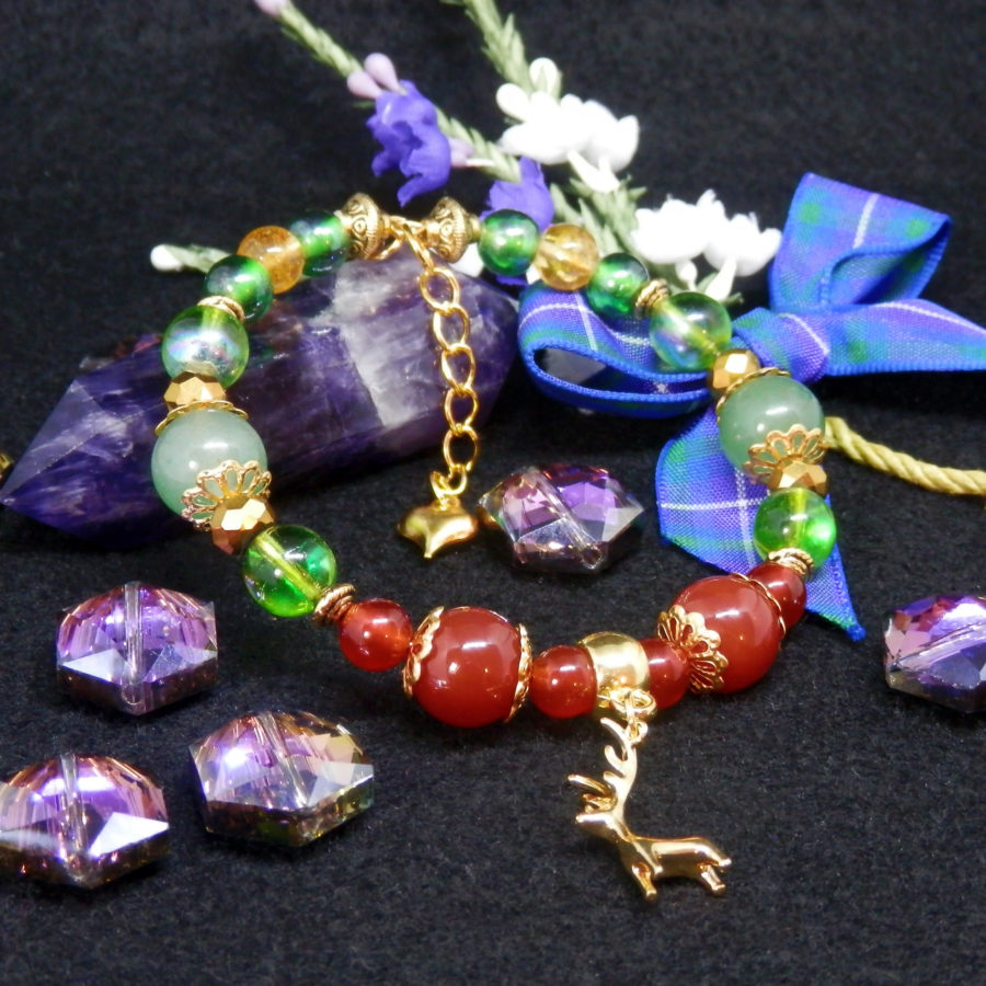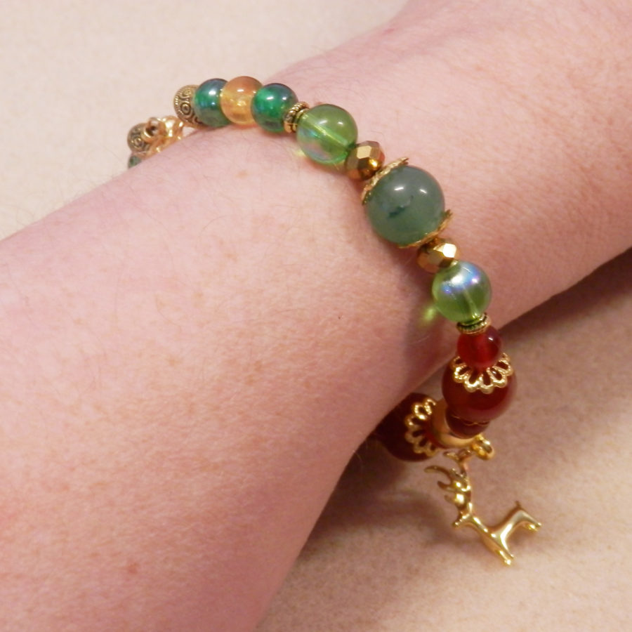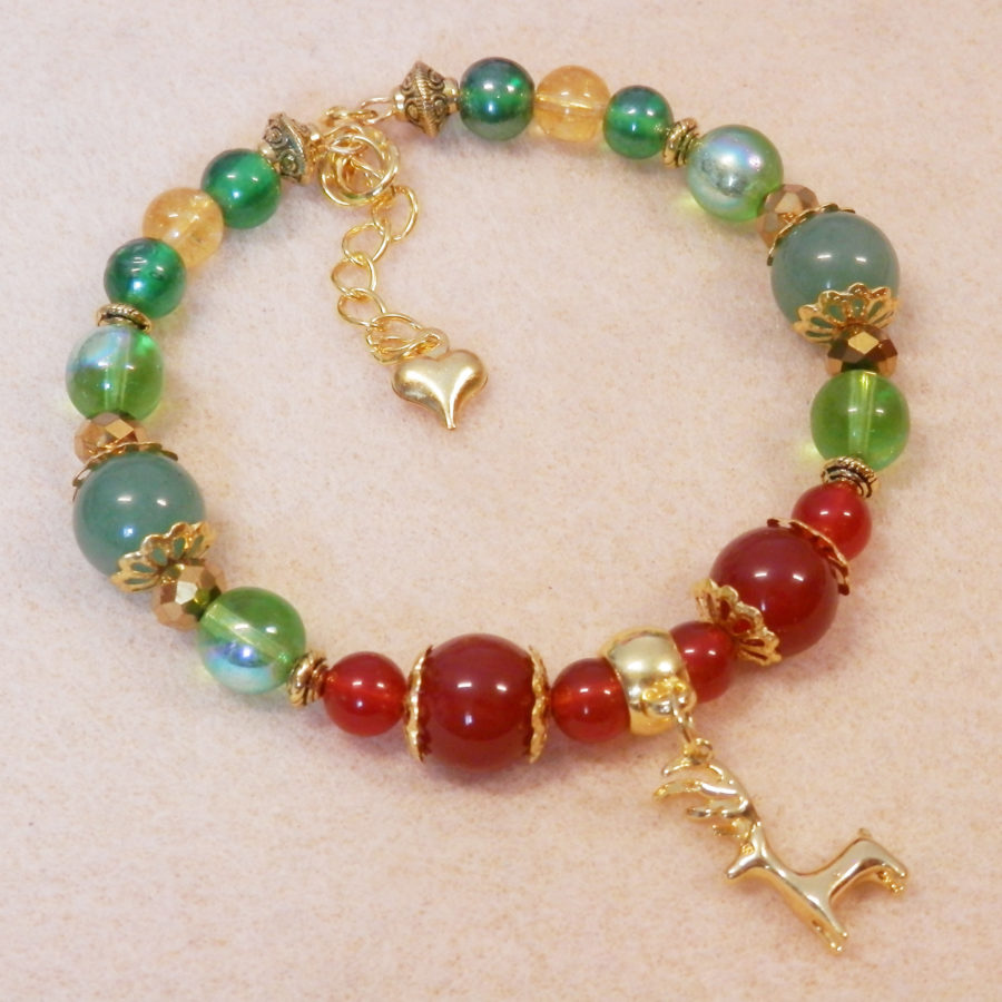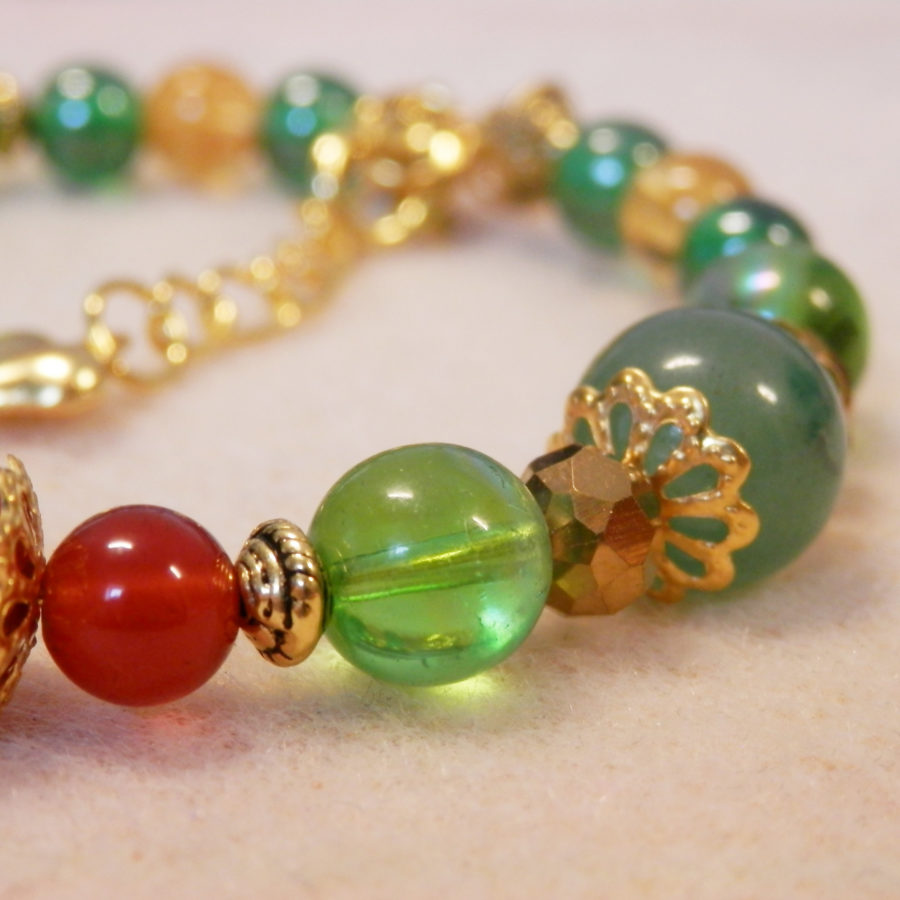 Beautiful handmade bracelet with red carnelian, green aventurine, and citrine gemstone beads, faceted and metallic gold coloured beads and green electroplated beads. All assembled onto memory wire that retains it's shape forever! This bracelet fastens with a lobster clasp and comes with an extension chain for the larger wrist. It would fit around 7 inch typically. Comes to you in a black gift box with padded insert. Lead and Nickel Free