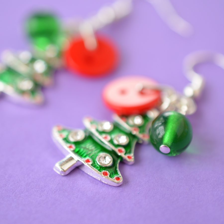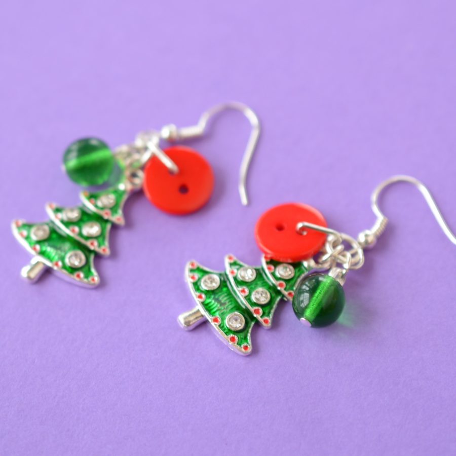 Cluster earrings made with a button, a bead and beautiful enamelled Christmas tree charm. Ear findings are sterling silver, other findings are silver-plated. Full length of earring from top of the hook is approx. 5 cm. Supplied in a gift pouch.
