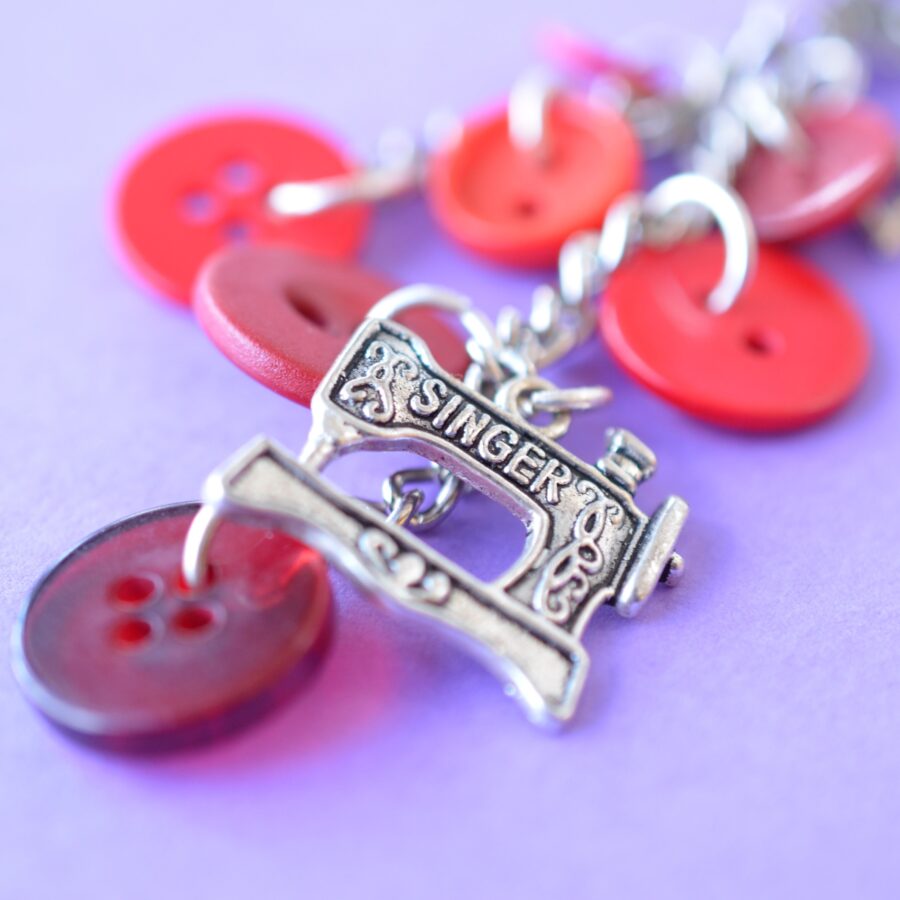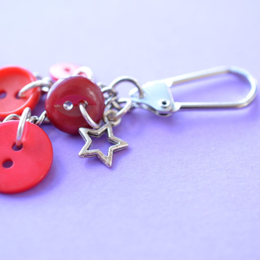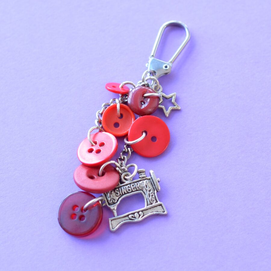 Wee cluster bag charm/keyring with red buttons and sewing machine and star charms. Full length of bag charm approx. 9.9 cm. Supplied in gift pouch. Pictures are examples of the bag charm and some variation in buttons may occur.