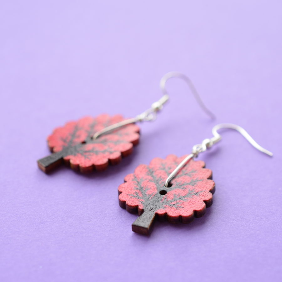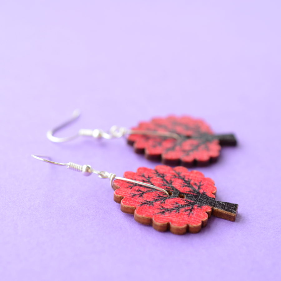 These earrings are a pair of large matching focal wooden tree buttons. The ear findings are sterling silver, other findings are silver-plated. The buttons are approx. 25mm across. The full length of earrings from the top of the hook is approx. 5.5cm. Supplied in a gift pouch.