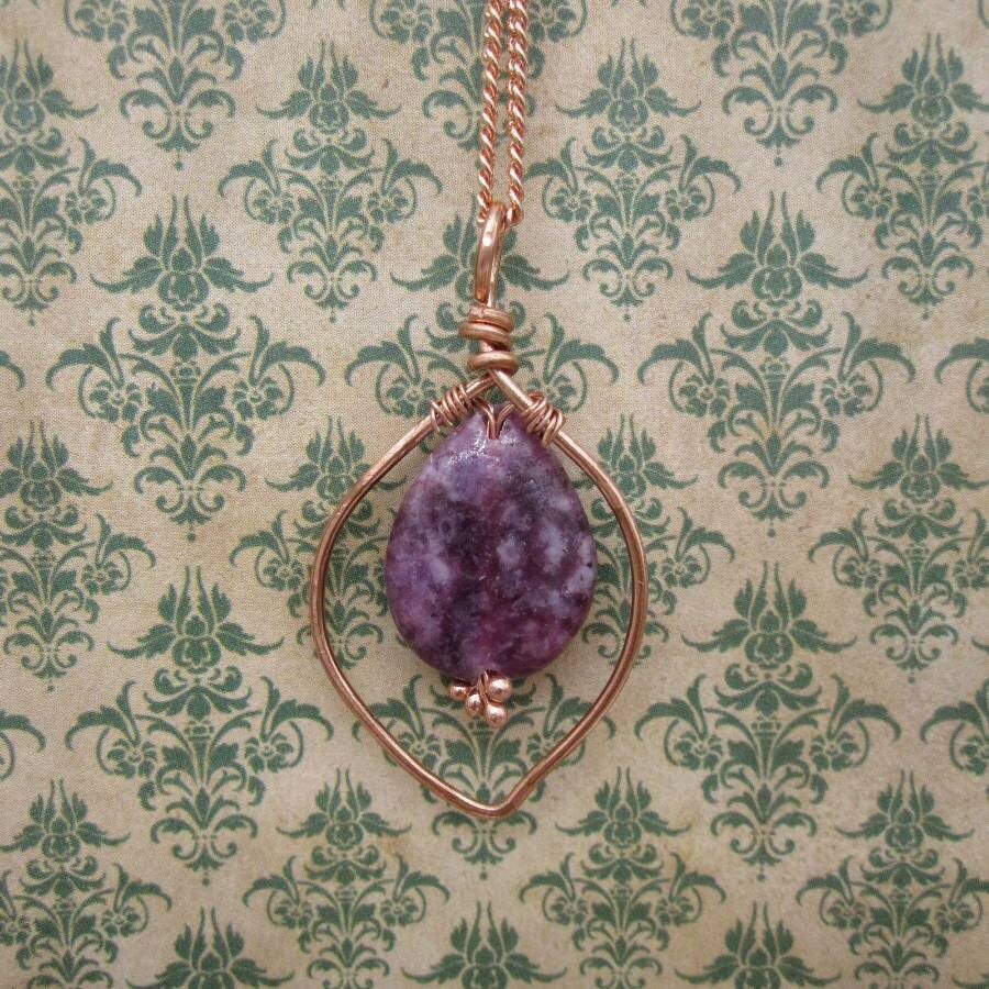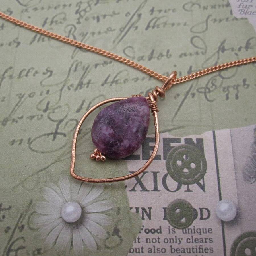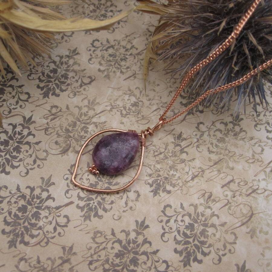This ‘one of a kind’ pendant features the gemstone lepidolite with its lilac pink subtle shimmer and calming energies. The maker was inspired by the natural landscape to add a leaf inspired frame in rose gold coloured copper wire. Lepidolite is sometimes referred to as the grandmother’s stone’ or the ‘peace stone’ and is associated with the zodiac sign of Libra.