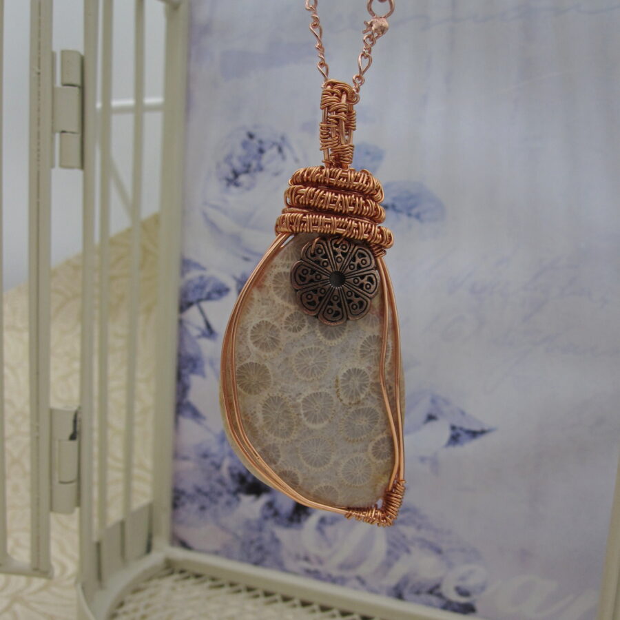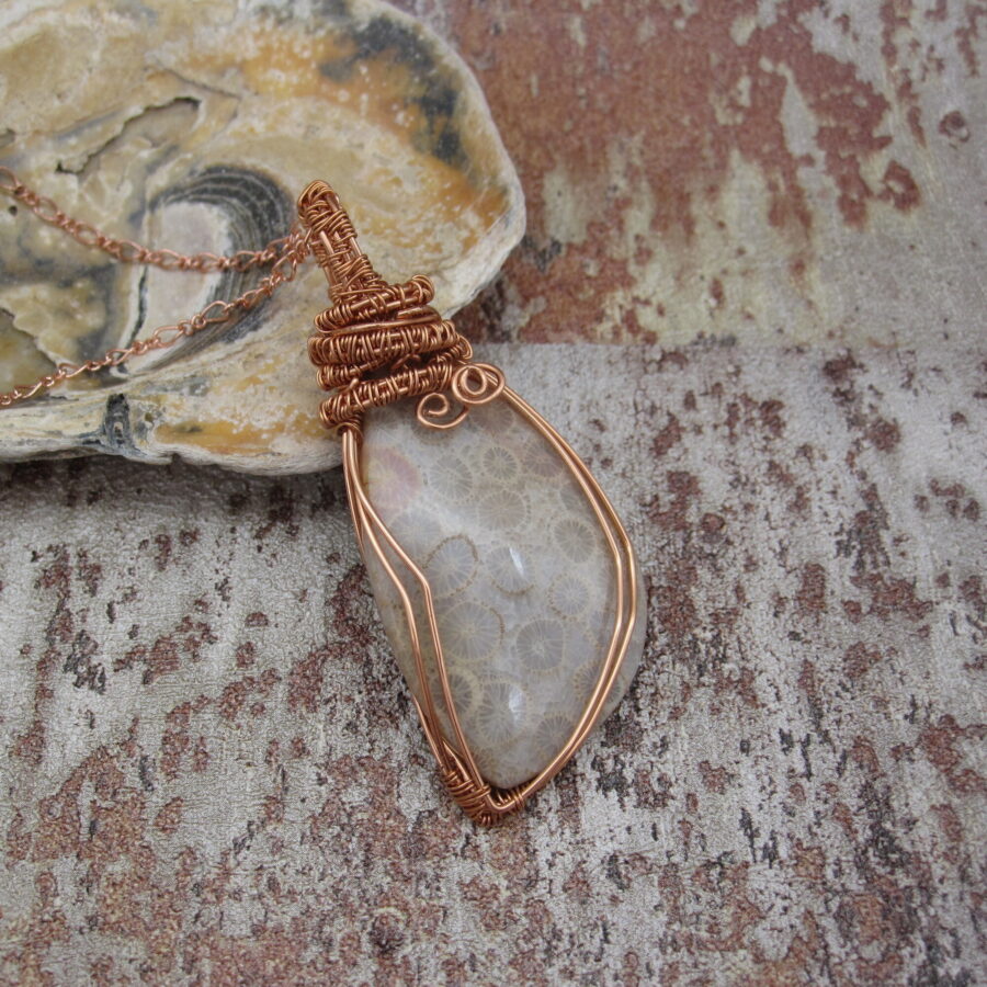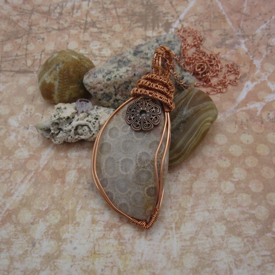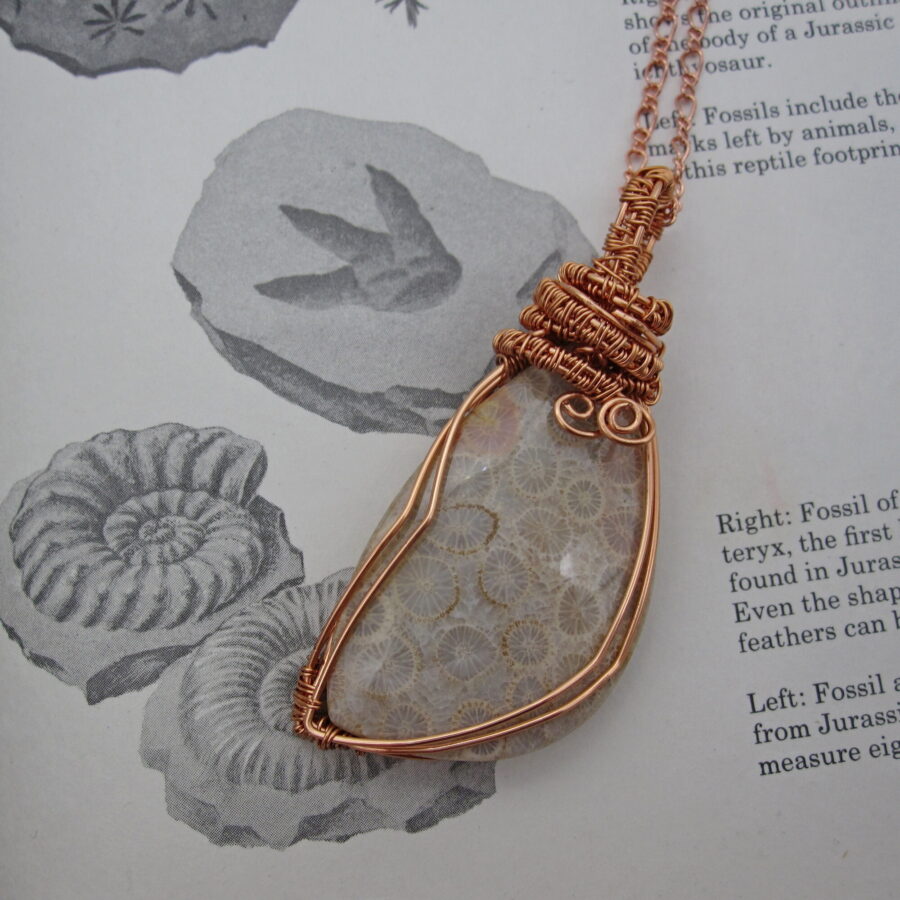 This stunning ‘one of a kind’ asymmetric pendant brings with it a strong sense of time and history, as well as drawing on the makers love of the sea. It bears witness to a process that only occurs under unique geological conditions and can take over 20 million years to unfold! Look closely and you will see tiny flower like patterns in the gemstone. These are the remains of ancient corals, giving this pendant an immediate connection with the ocean.