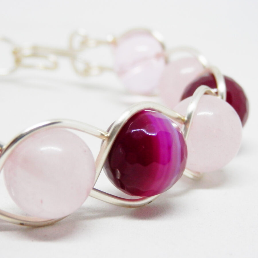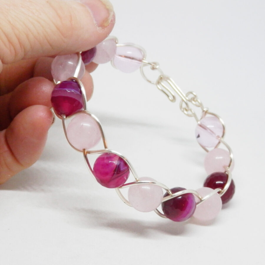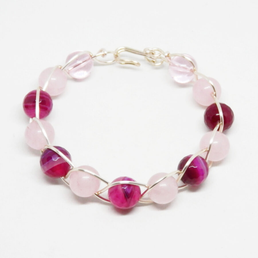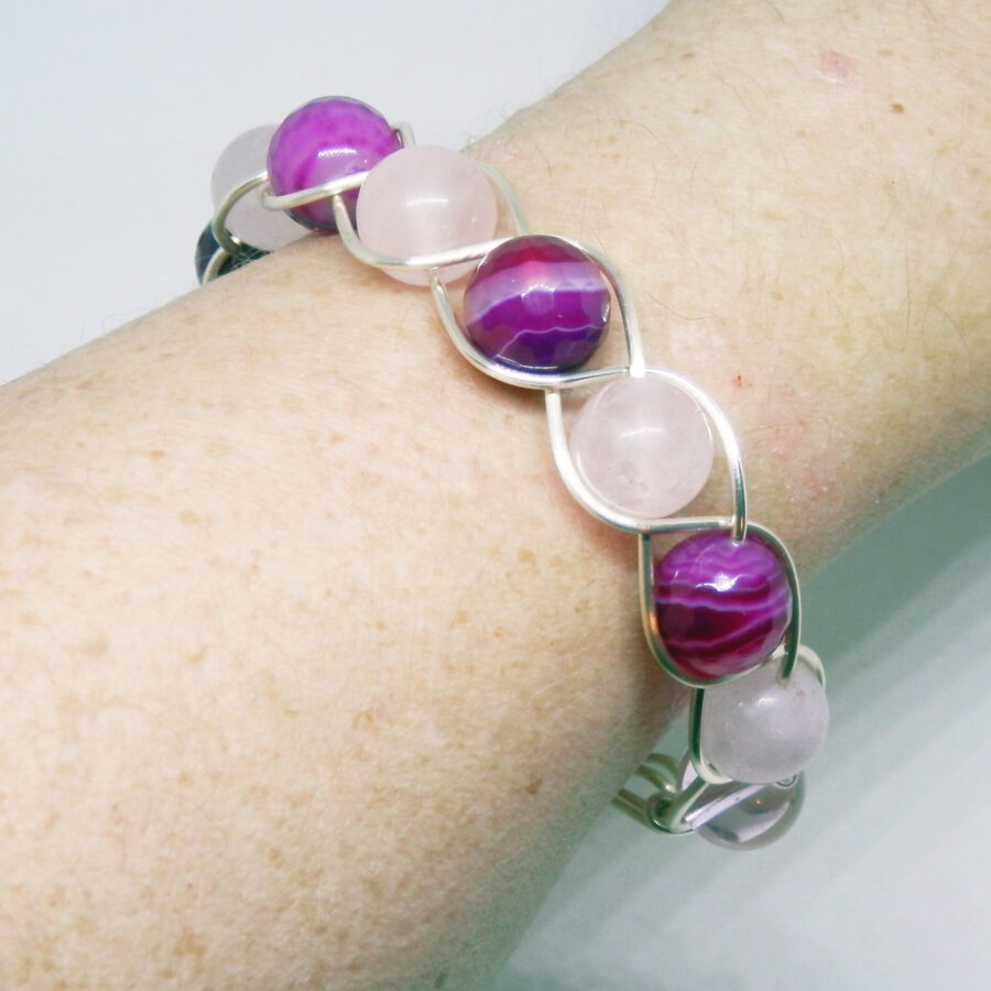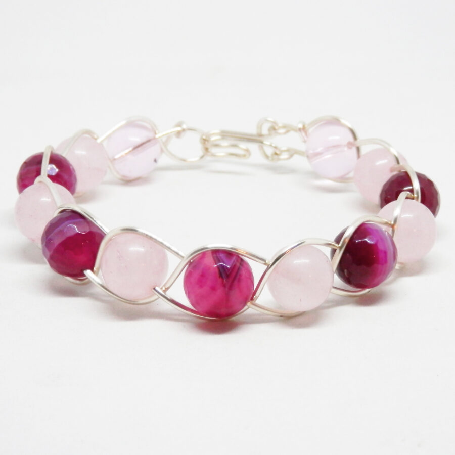 A fabulous handcrafted bracelet made with beautiful 12 mm rose quartz and faceted pink agate beads, threaded onto silver plated copper wire, and woven into a simple Celtic braid pattern. Would fit up to an 8 inch wrist maximum, and fastens with a hand made clasp. Comes to you in an organza bag. Lead and nickel free