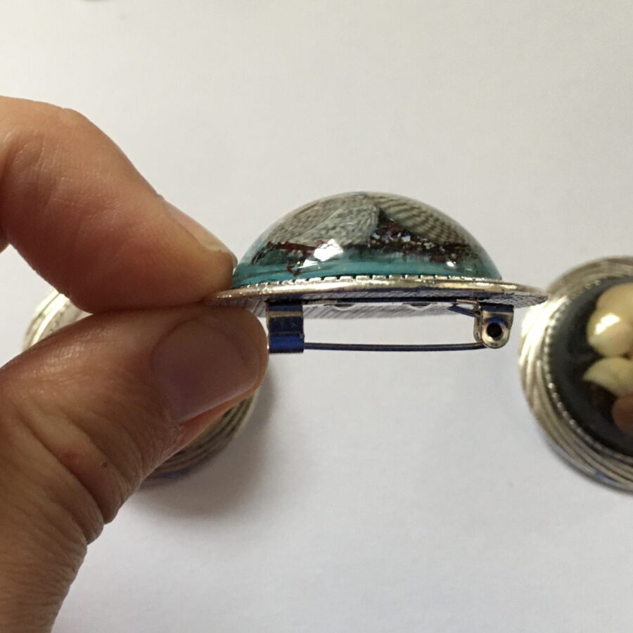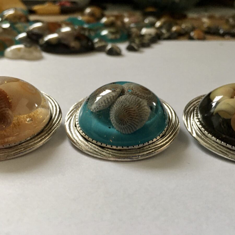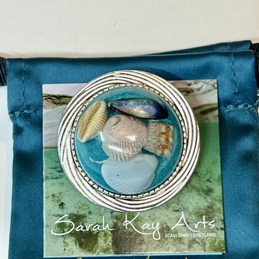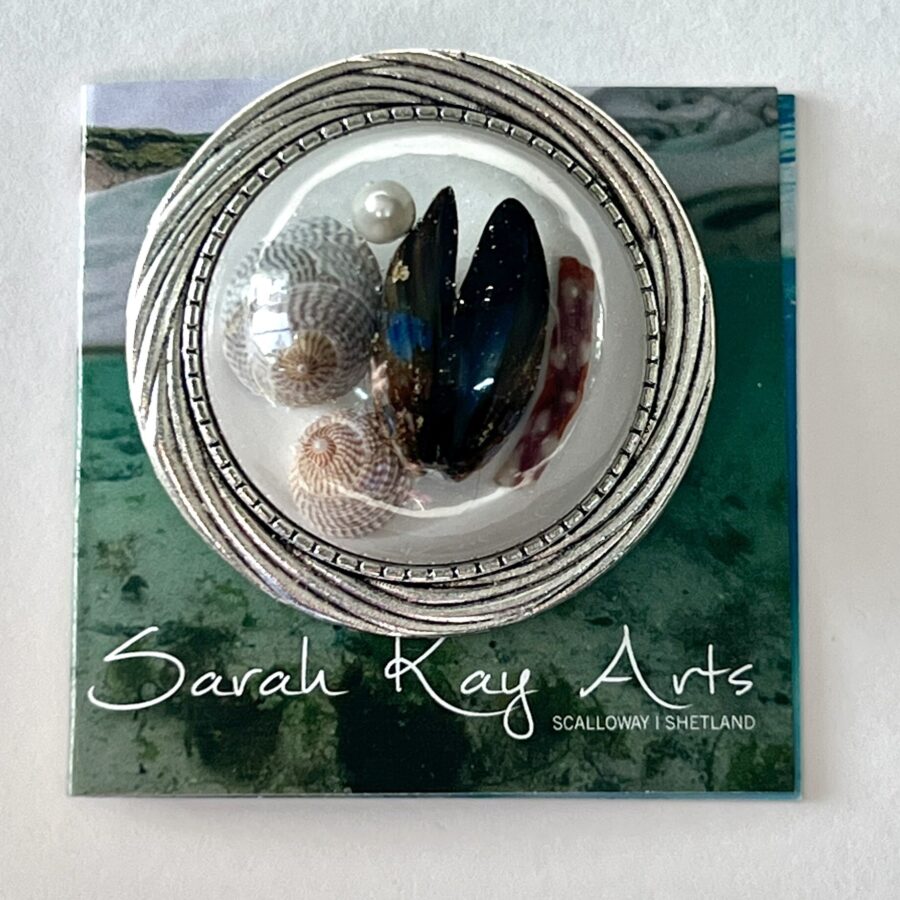 These brooches are made from the tiny shells, seaweed and other treasures Sarah finds on the beaches on Shetland. Each brooch is slightly different and original. The brooches are made with mica powders to colour the background which shimmer in the light. Please choose your favourite from shimmering black, sea blue or white.