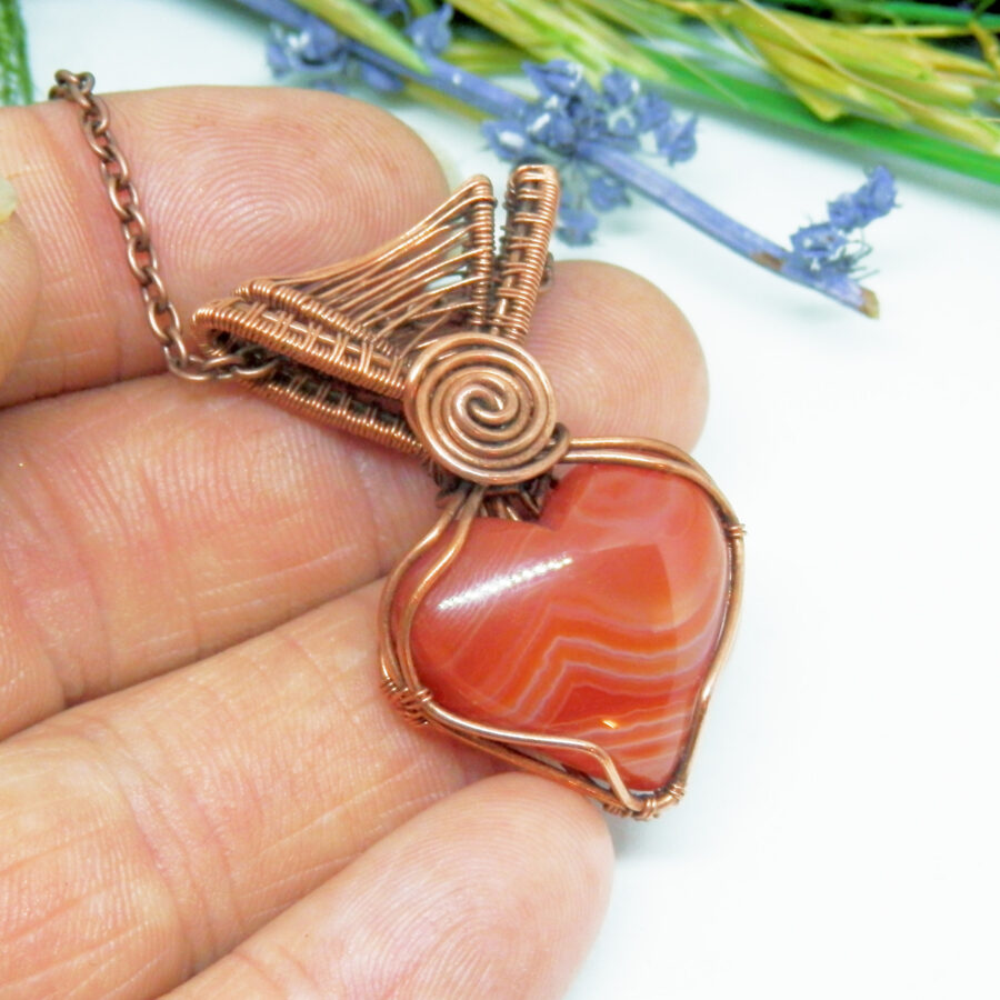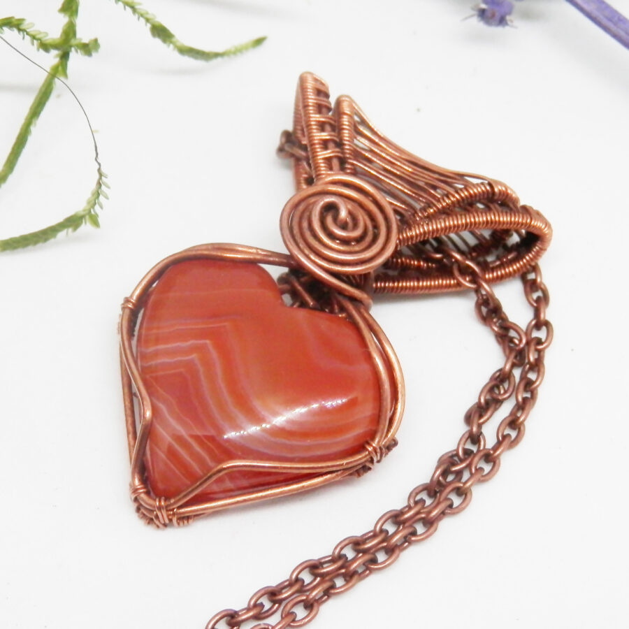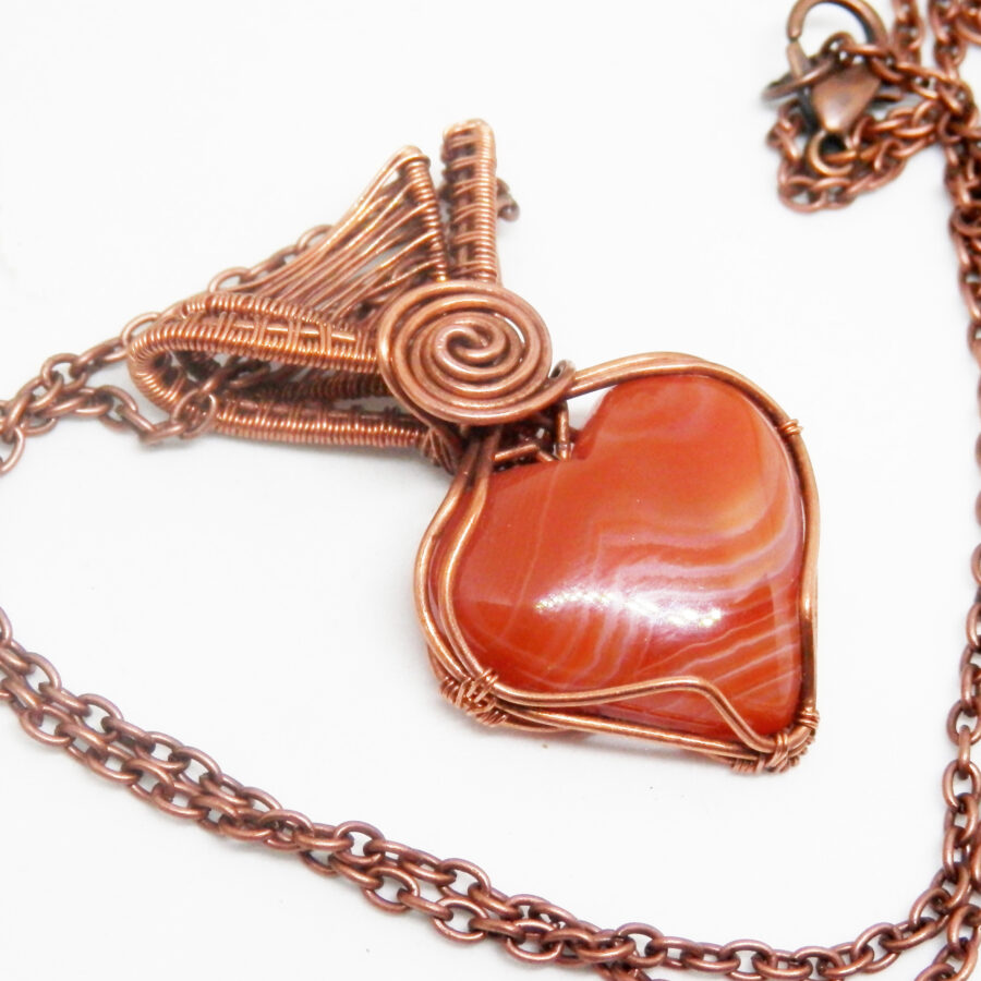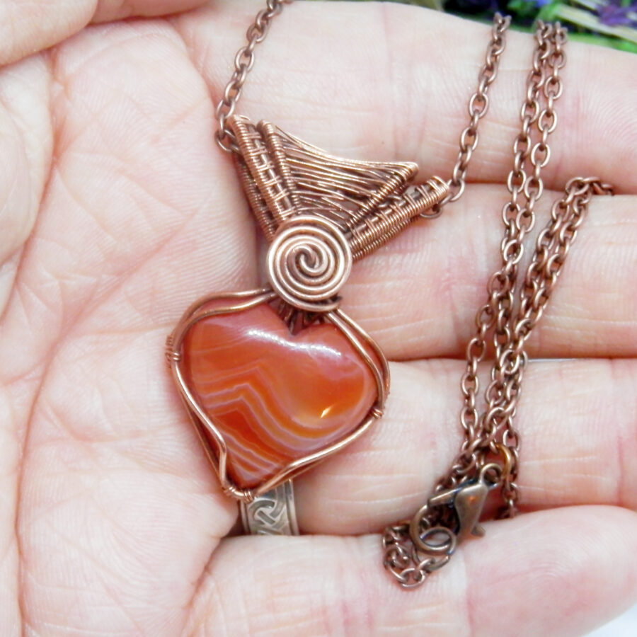 A beautiful Celtic style wire wrapped necklace, made with 'antiqued' copper wire wrapped around a beautiful heart shaped sardonyx cabochon. It has a beautiful woven bail, and Celtic swirl focal point. It comes with a 22 inch copper chain with lobster clasp. Lead and nickel free. This wire wrapped pendant will come to you placed in a soft velvet pouch.
