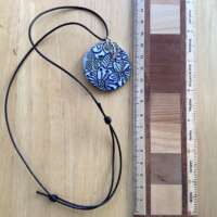 This ceramic pendant is made of white stoneware clay with an embossed ‘Woodland’ design filled with a Scandinavian Blue glaze. The leather cord is adjustable in length, with a drop from the back of the neck of approx. 20-30 cm. This makers designs are all individually handcrafted with no two pieces being the same.
