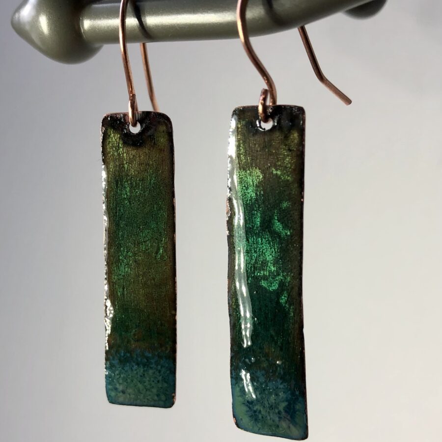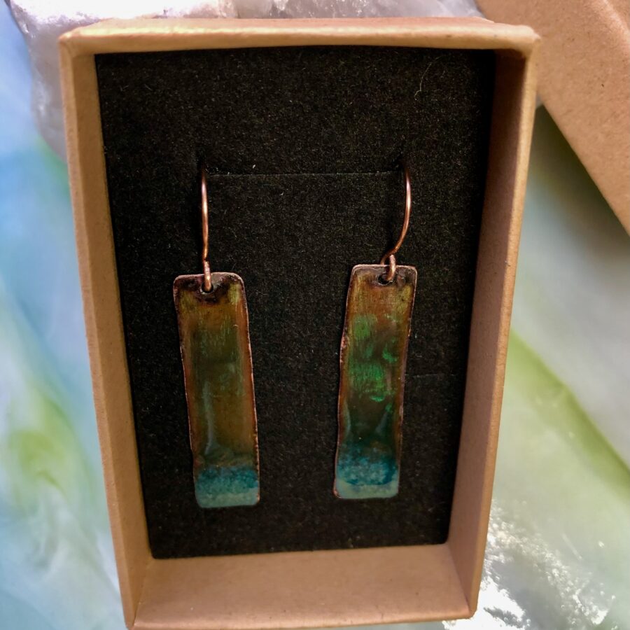 A pretty pair of enamelled copper earrings in seagreen with copper ear wires. Counter enamelled on the back.