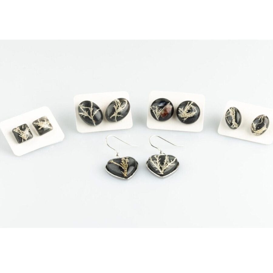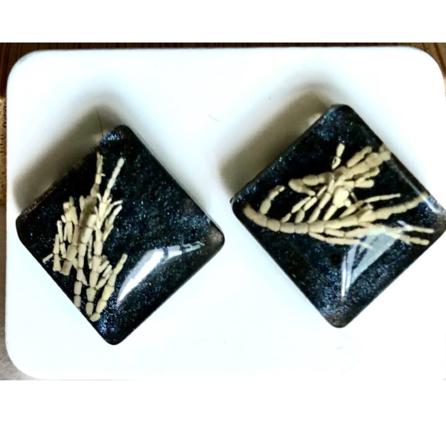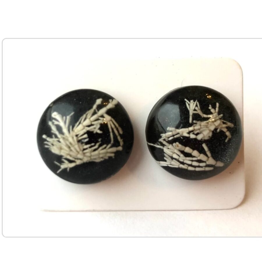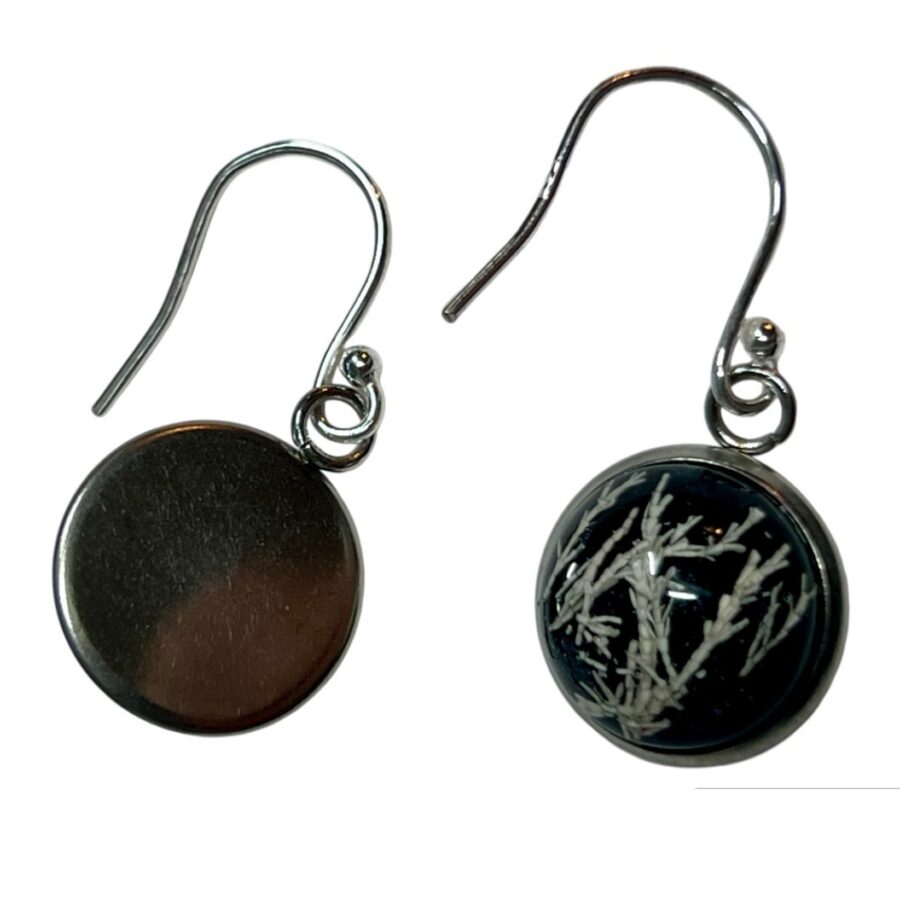 These earrings use natural colours with a shimmering black background complimenting the white seaweed. The seaweed is handpicked from beauty spots around the Shetlands coast, captured in clear resin for you to treasure. Choose your preferred style (stud or dangly) and size of stud earrings - tear drop 1.7 cm long, oval 1.4 cm, circle 1 cm, square 1.1 cm, heart 1.7 cm across.