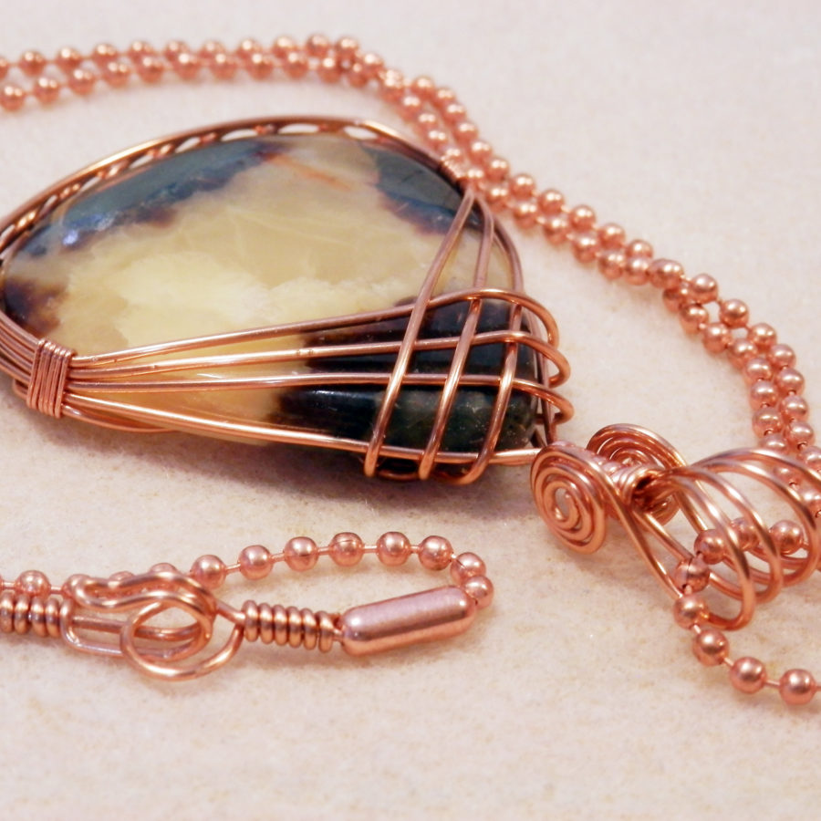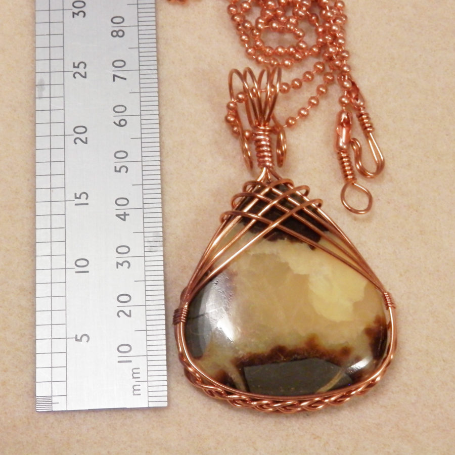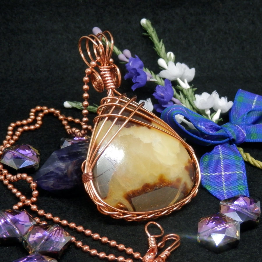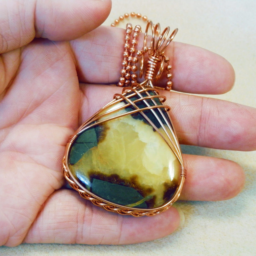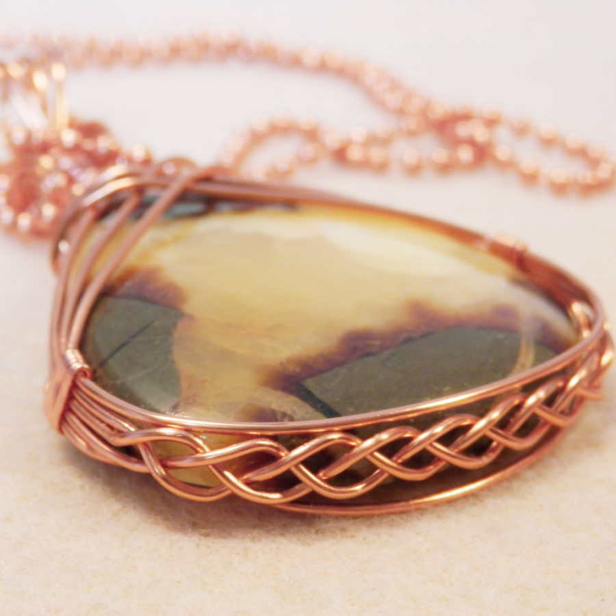 Unique wire wrapped gemstone pendant. This is a beautiful deep yellow teardrop shaped gemstone, with chocolate coloured spots has been wrapped in tarnish resistant copper wire and incorporated some Celtic braiding and swirls, even on the back! The pendant is around 7 cm long by 4.4 cm wide and 1 cm thick at the deepest point. It comes with a 24 inch hand made raw copper chain with hand made hook clasp. Lead and nickel free. This wire wrapped pendant will come to you placed in a soft velvet pouch.