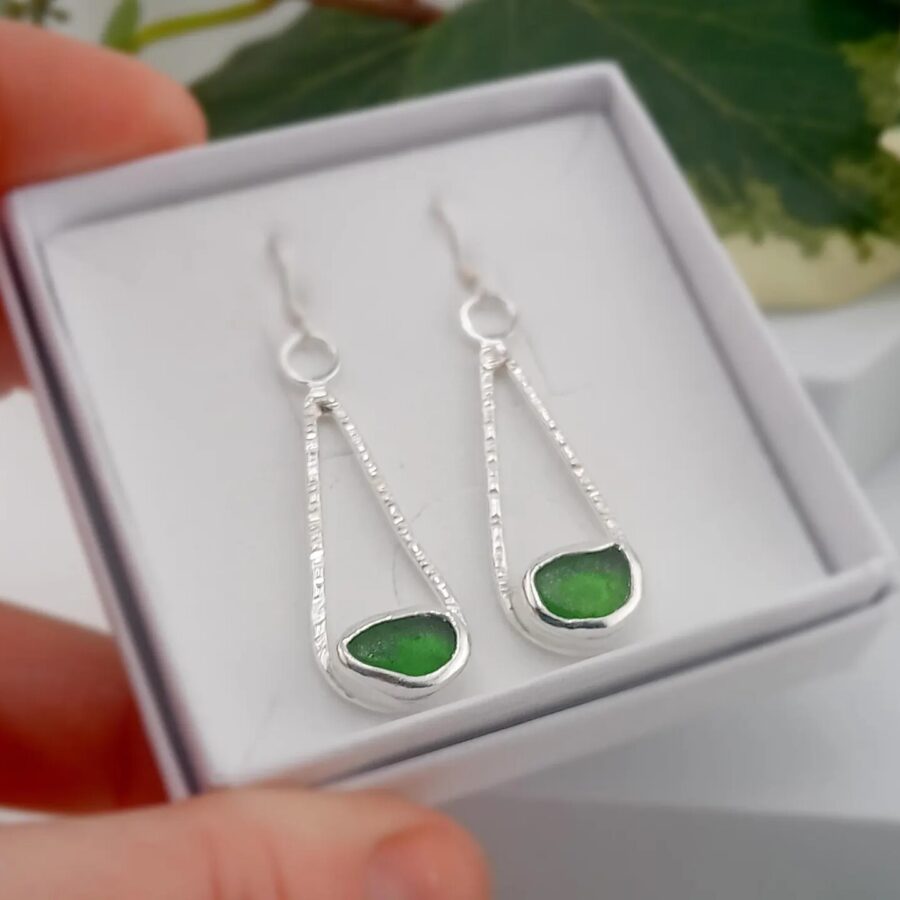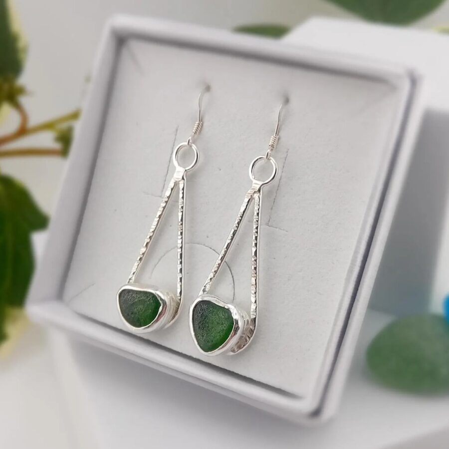 These beautiful earrings are hand hammered sterling silver wire shaped into a teardrop shape. Adding a sterling silver bezel wrapped sea glass to create a beautiful and very individual eye-catching pair of earrings. The earrings hang approx 5 cm drop and come in a beautiful gift box. Each piece is textured by hand so no two pieces are the same, giving a more interesting design.