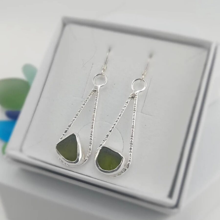 Just received my order and very pleased. Beautiful! dangling sea glass earrings. Look a bit smaller than website photo but well made with intricate detail on the silver. Just perfect for a gift with great info included. Bought to give to someone on my trip to Australia