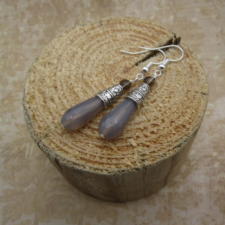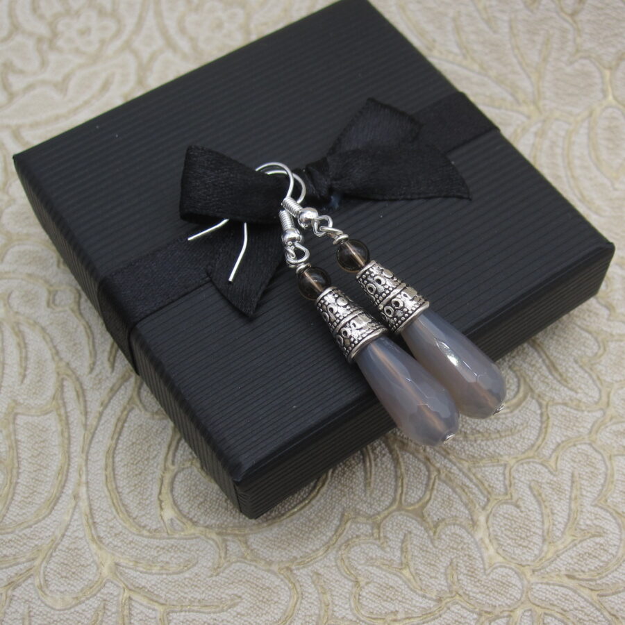 Inspired by traditional Celtic design, these stylish drop earrings feature Scotland’s national gemstone smokey quartz with grey agate. Smokey quartz is believed to have calming energies and is sometimes referred to as the ‘dream stone’. A great gift choice for saying – slow down, take a deep breath and relax.