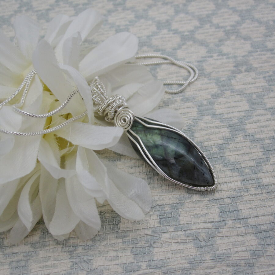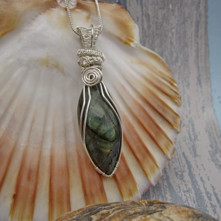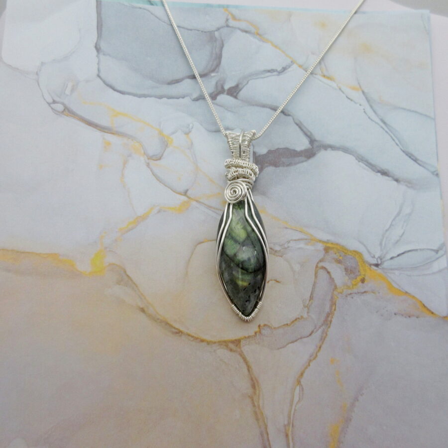 The gemstone labradorite with its beautiful optical qualities make this pendant something special. First discovered in Labrador Canada, where the indigenous Inuit tribes called it ‘fire stone’, Labradorite flashes greens, golds and blues. This particular gemstone reminded the maker of a mussel shell with its iridescent sheen and the wire wrap detail was intended to complement the gemstones’ shape and form.