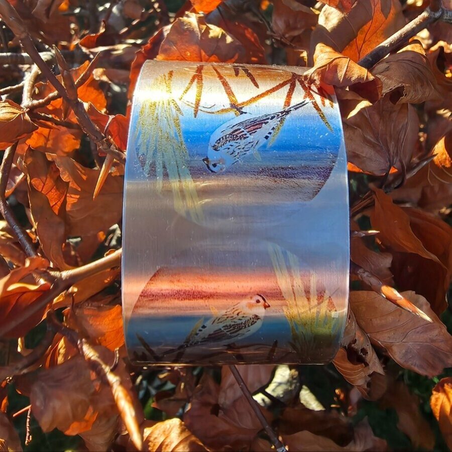 This gorgeous wide cuff bracelet features "Snow Bunting" artwork by Hannah MacIver. It is made from aluminium. Hannah prints and makes the artwork transfers then slides them onto the aluminium she has previously bent into the cuff shape. Once dried she sands the edges and seals them with a coat of UV resin. As these are handmade the finish for each will be slightly differently. A matching narrow cuff bracelet and snow bunting earrings are also available.