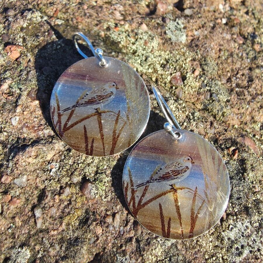 These gorgeous earrings feature "Snow Bunting" artwork by Hannah MacIver. They are made from aluminium discs with sterling silver ear wires. Hannah prints and makes the artwork transfers then slides them onto the aluminium. Once dry they are sealed in a layer of UV resin. A matching Snow Bunting cuff bracelets are also available.