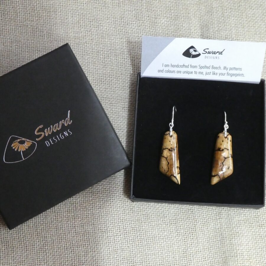 A unique pair of hand-turned spalted beech asymmetric drop earrings, with sterling silver ear wires.