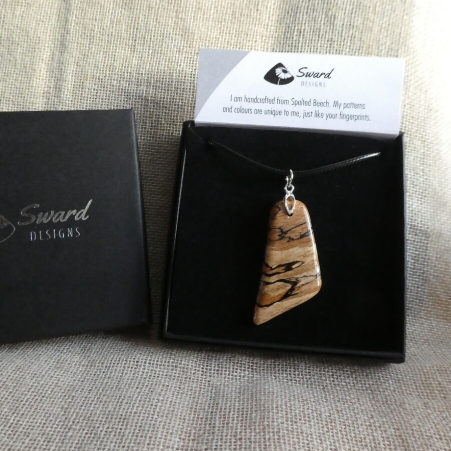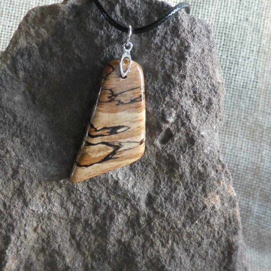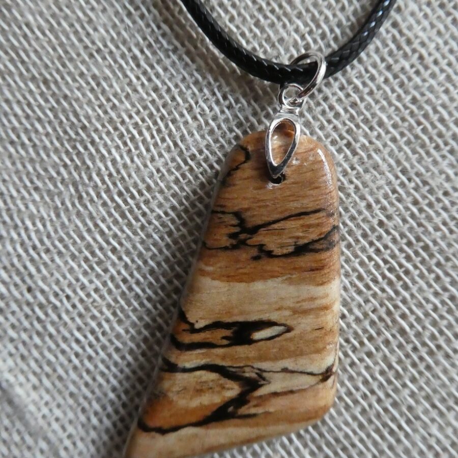 A spalted beech wood asymmetrical shaped pendant with sterling silver fixing, on a waxed cotton cord.