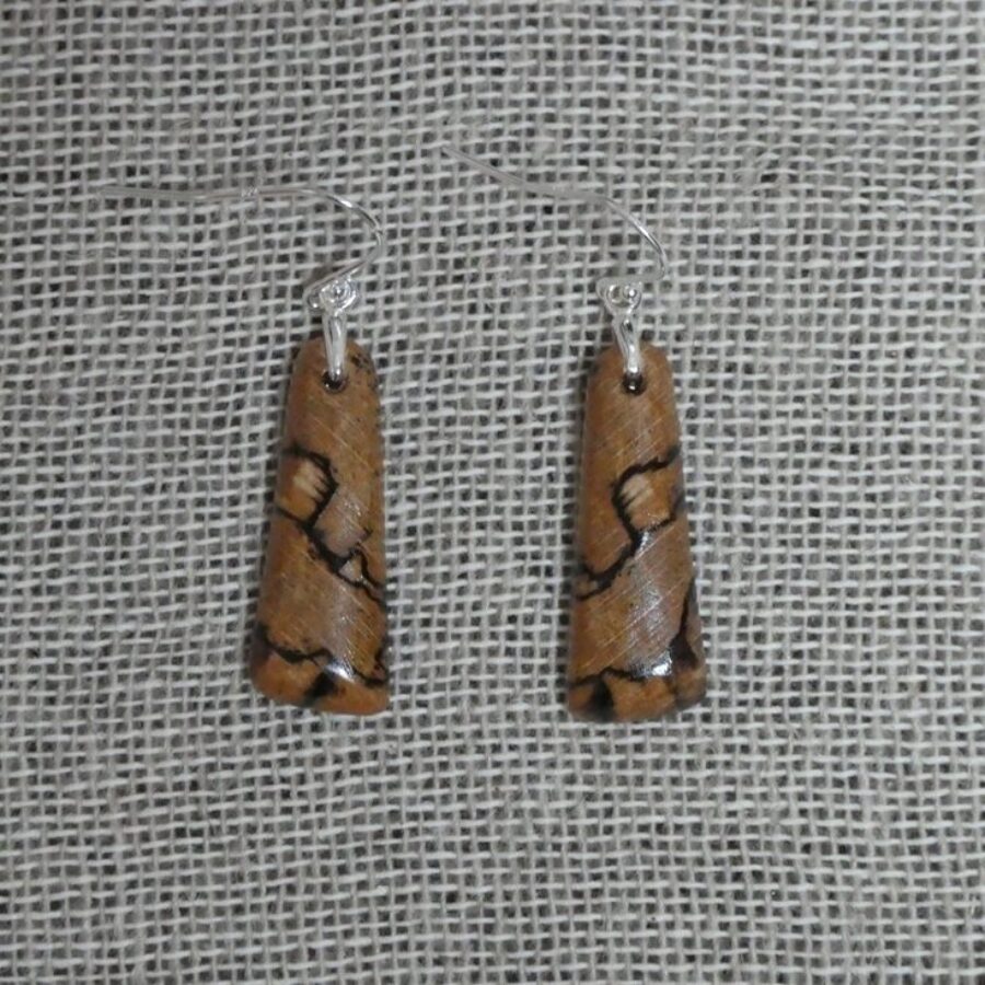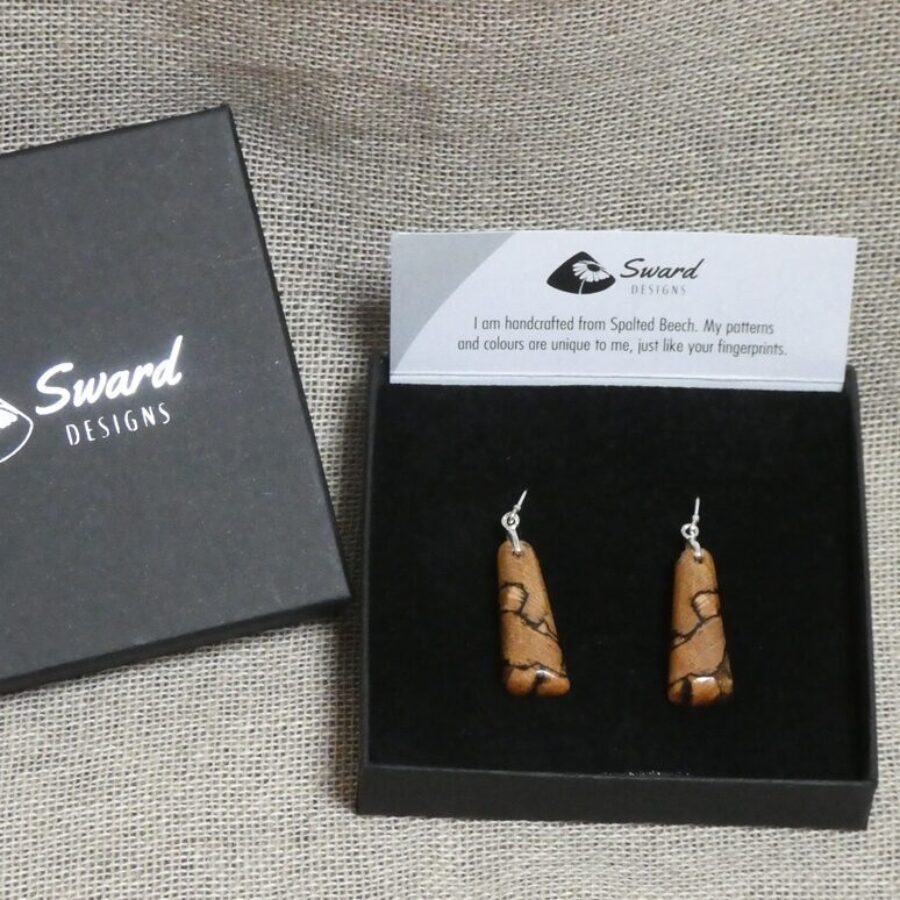 A unique pair of hand-turned spalted beech drop earrings, with sterling silver ear wires.
