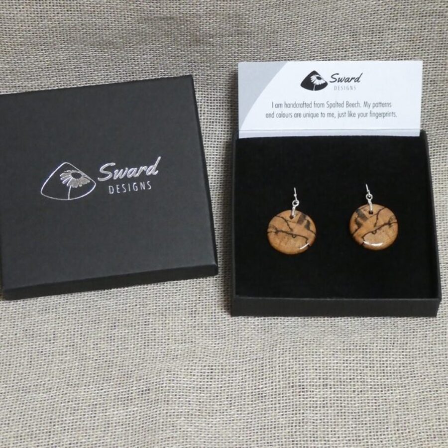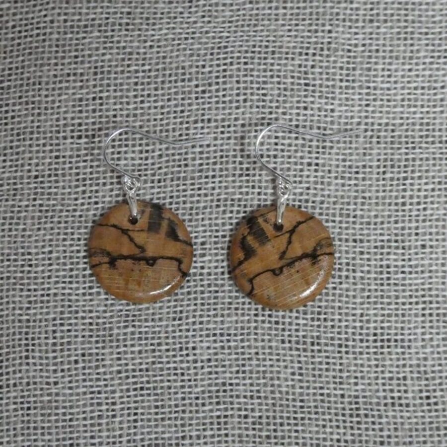 A unique pair of hand-turned spalted beech round earrings, with sterling silver ear wires.