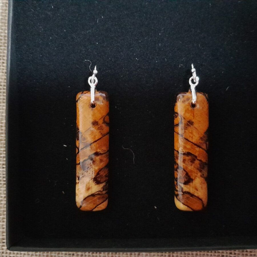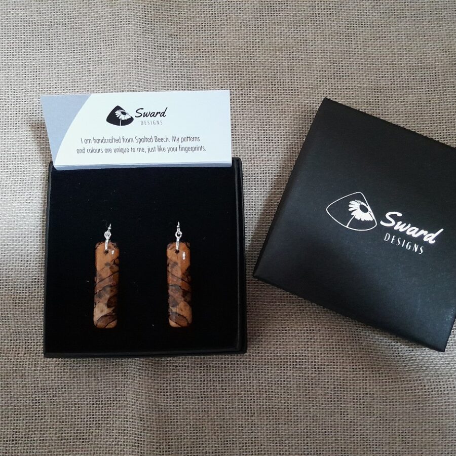 A unique pair of spalted beech wood, straight drop earrings with sterling silver findings.