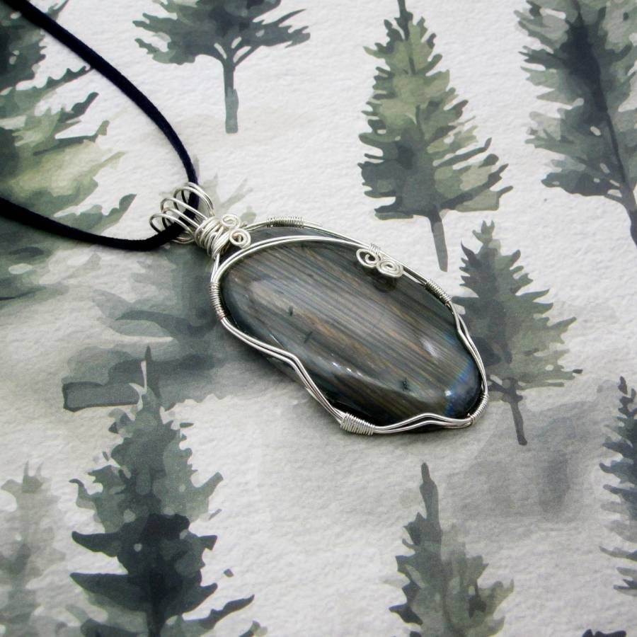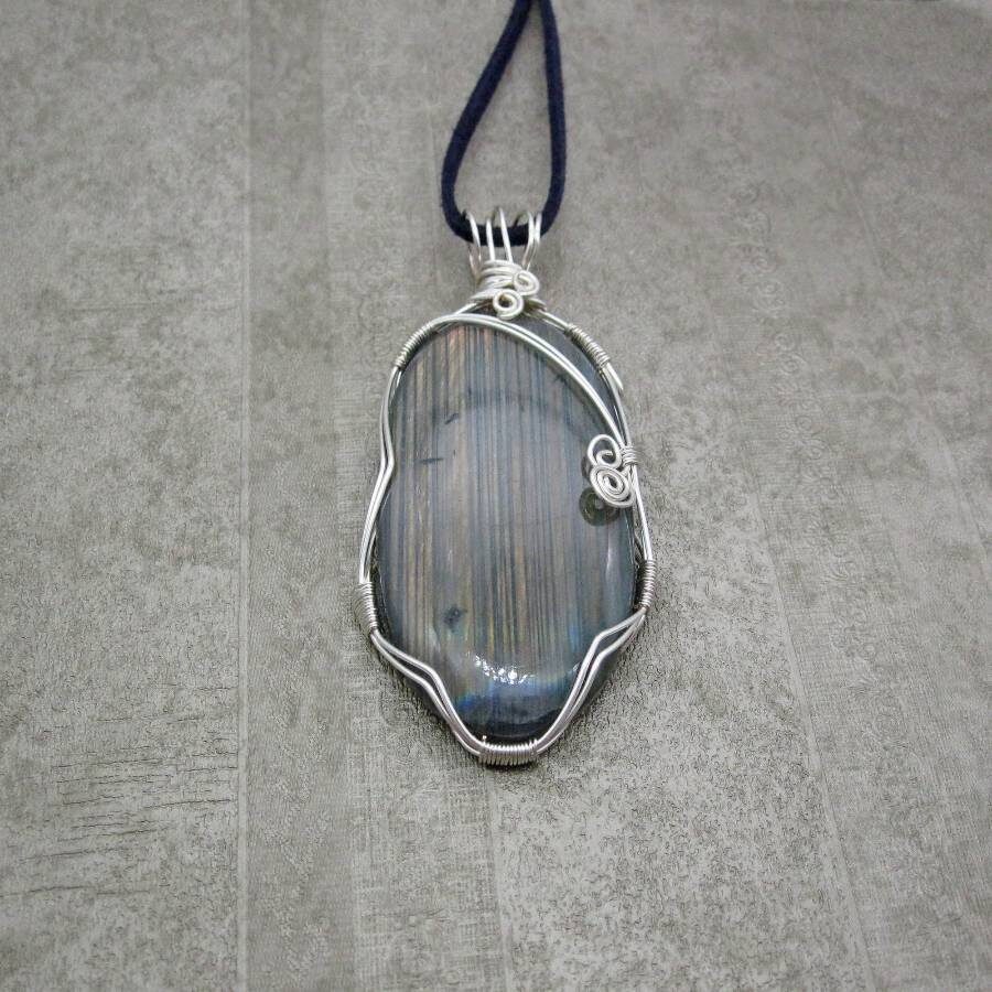 This ‘one of a kind’ pendant is all about the gemstone. If you love labradorite then this is one for you. Known for its optical qualities, of course no two pieces of labradorite will ever be the same but this one is especially stunning with vertical pinstripes of golds and greens with an elusive wee rainbow at the base. The maker has given this piece a simple silver plated wire frame finished with Celtic spirals – it’s a case of let the gemstone do the talking!