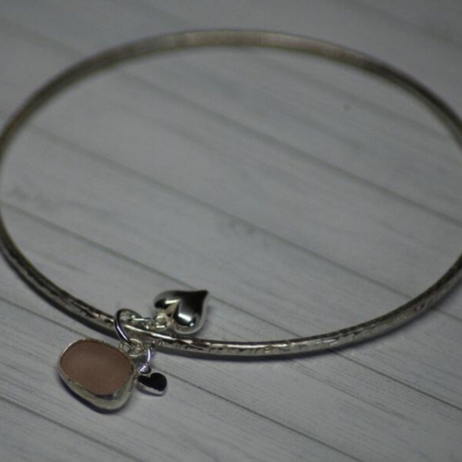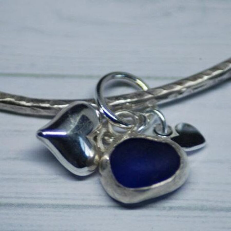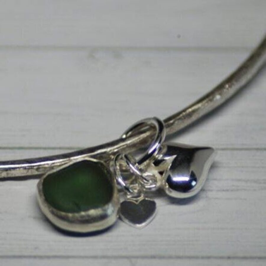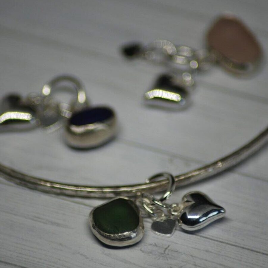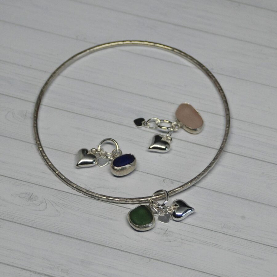 A beautiful textured and delicate bangle made with 2mm sterling silver wire and featuring locally found sea glass set in sterling silver together with two sterling silver heart charms. The perfect gift for a loved one or treat for yourself. Choose from blue, green or white/clear sea glass. Comes in an Organza bag.